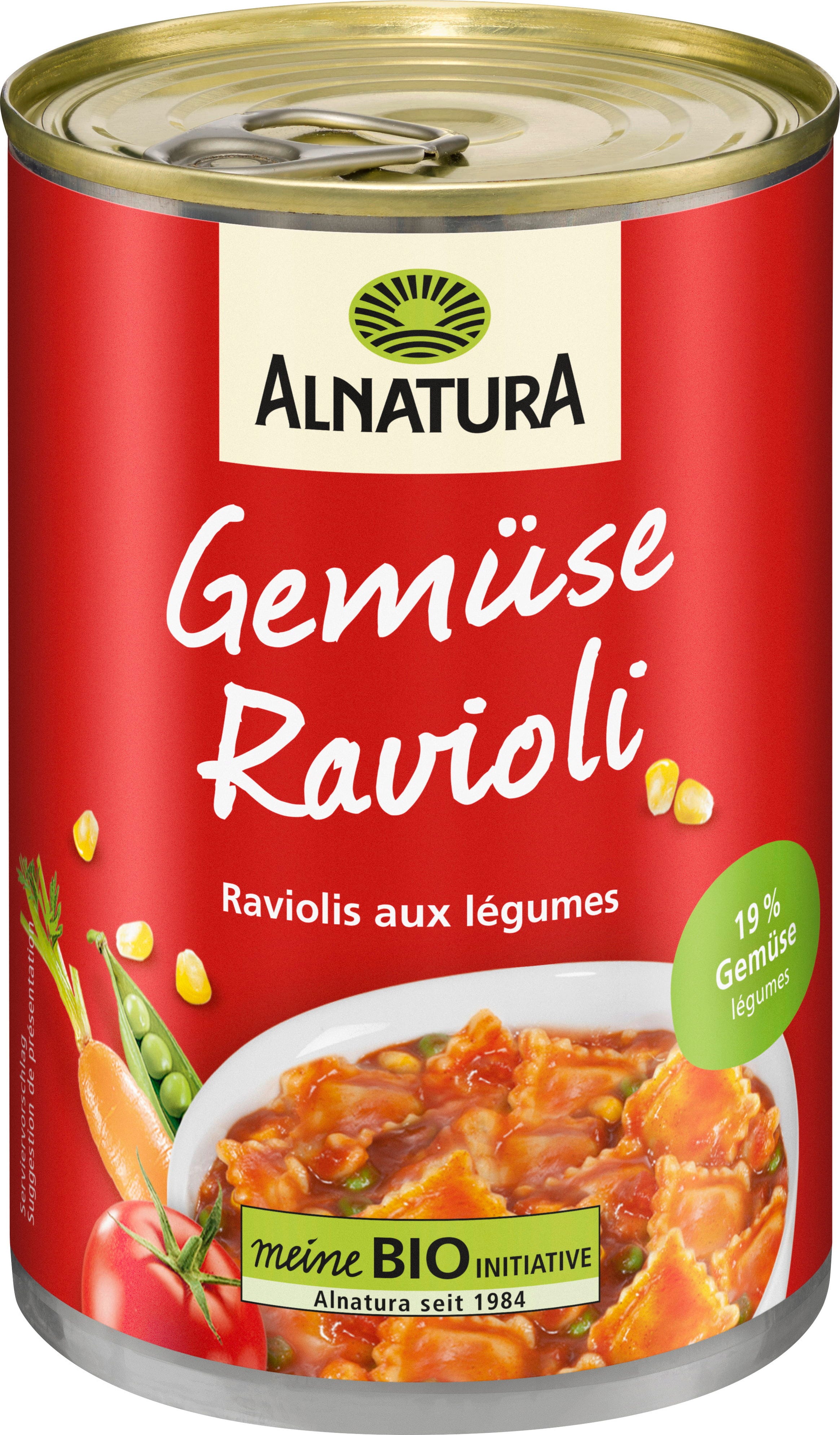 55 % Tomatensauce (34 % Tomatenmark einfach konzentriert[1], Wasser, 12 % Tomaten[1], 5 % Karotte[1], 4 % Mais[1], 4 % Erbsen[1], 4 % Karottenpüree[1], Paprika[1], Rohrohrzucker[1], Meersalz, Sellerie[1], Maisstärke[1], Gewürze[1], Basilikum[1], Zitronensaftkonzentrat[1]), 45 % Ravioli gekocht (Wasser, Hartweizengrieß[1], Kartoffelflocken[1], Semmelbrösel[1] (Weizenmehl[1], Hefe[1])), 1 % Karotte[1], Pastinake[1], Zwiebel[1], Paprika[1], Sonnenblumenöl[1], Gemüsebrühe[1] (Meersalz, Zwiebel[1], Karotte[1], Lauch[1], Pastinake[1], Kräuter[1], Gewürze[1]), 0,4 % Tomaten[1], Spinat[1], Gewürze[1]