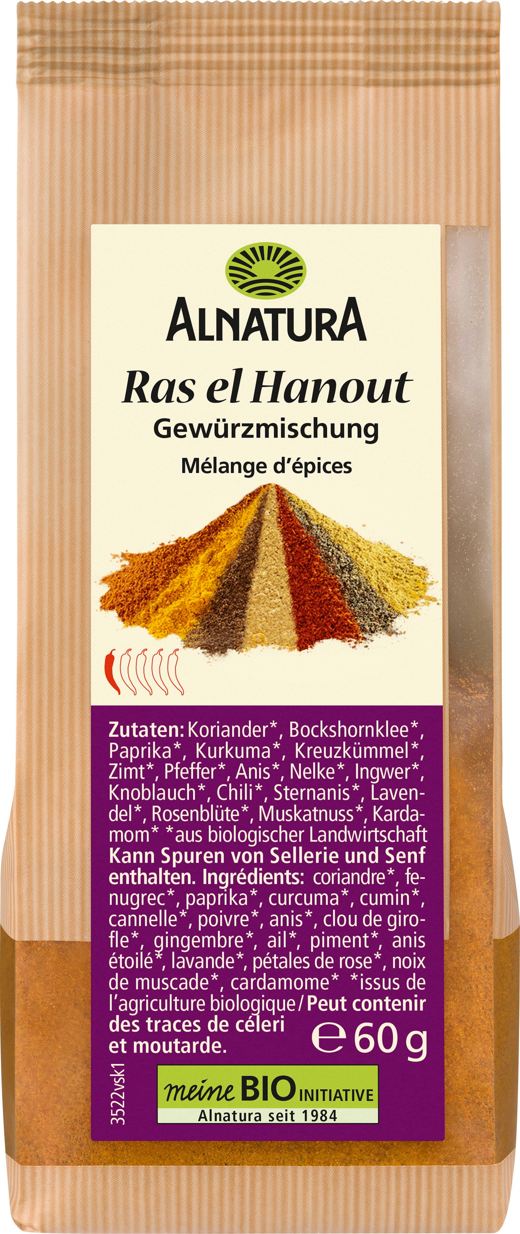 Die Komposition Alnatura Bio Ras el Hanout besteht aus 17 pikanten und duftenden Bio-Gewürzen wie Koriander, Bockshornklee, Kurkuma sowie Zimt, Rosenblüten und Muskatnuss. Übersetzt bedeutet der Name "Kopf des Ladens" und verkörpert die Quintessenz der traditionellen marokkanischen Gewürzkunst.