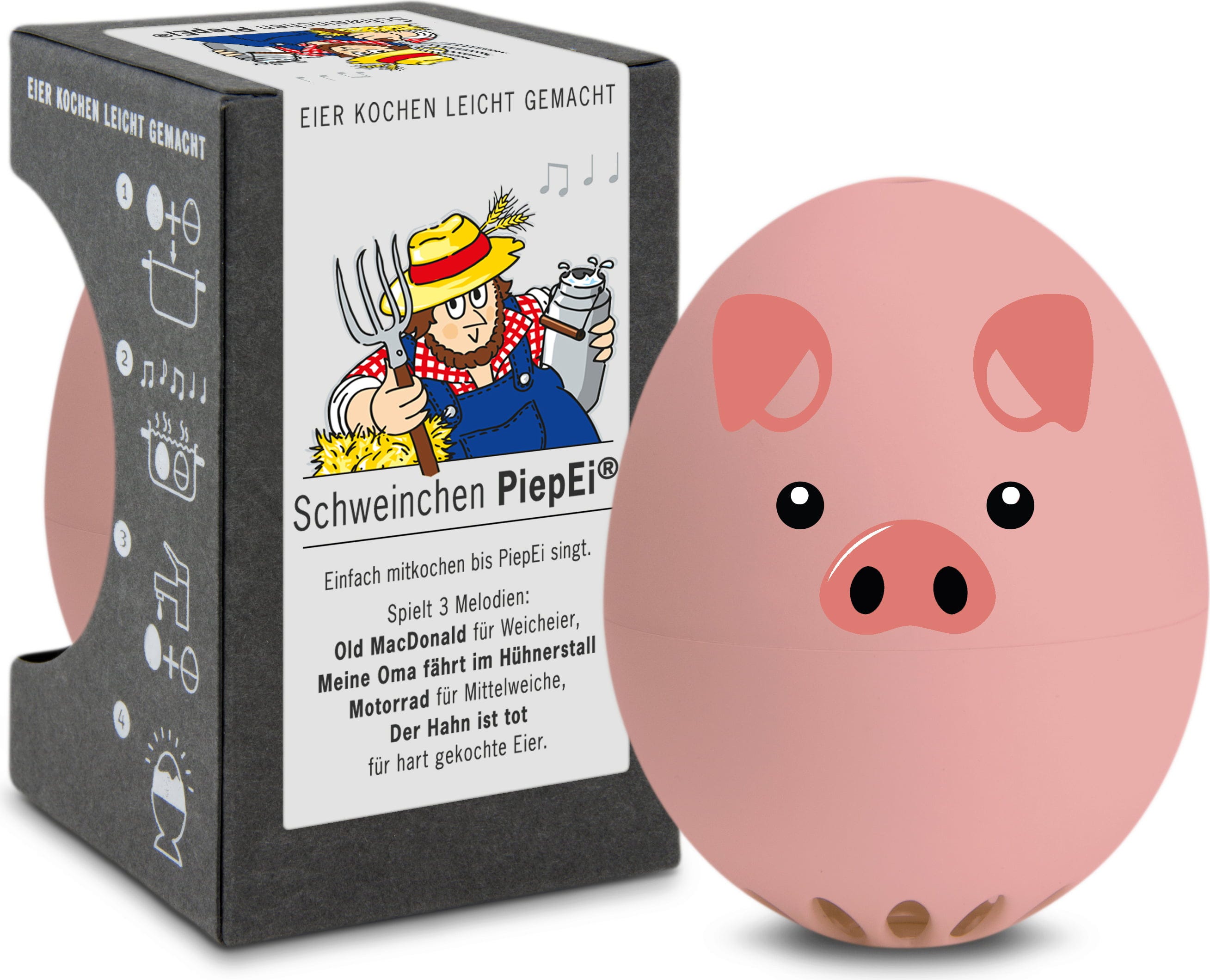 Einfach das Schweinchen PiepEi mit den Eiern lagern, gemeinsam kochen und warten, bis die Melodie des gewünschten Härtegrades spielt. Unabhängig davon, mit welcher Wassertemperatur man startet, welche Eiergröße und auf welcher Höhe gekocht wird.