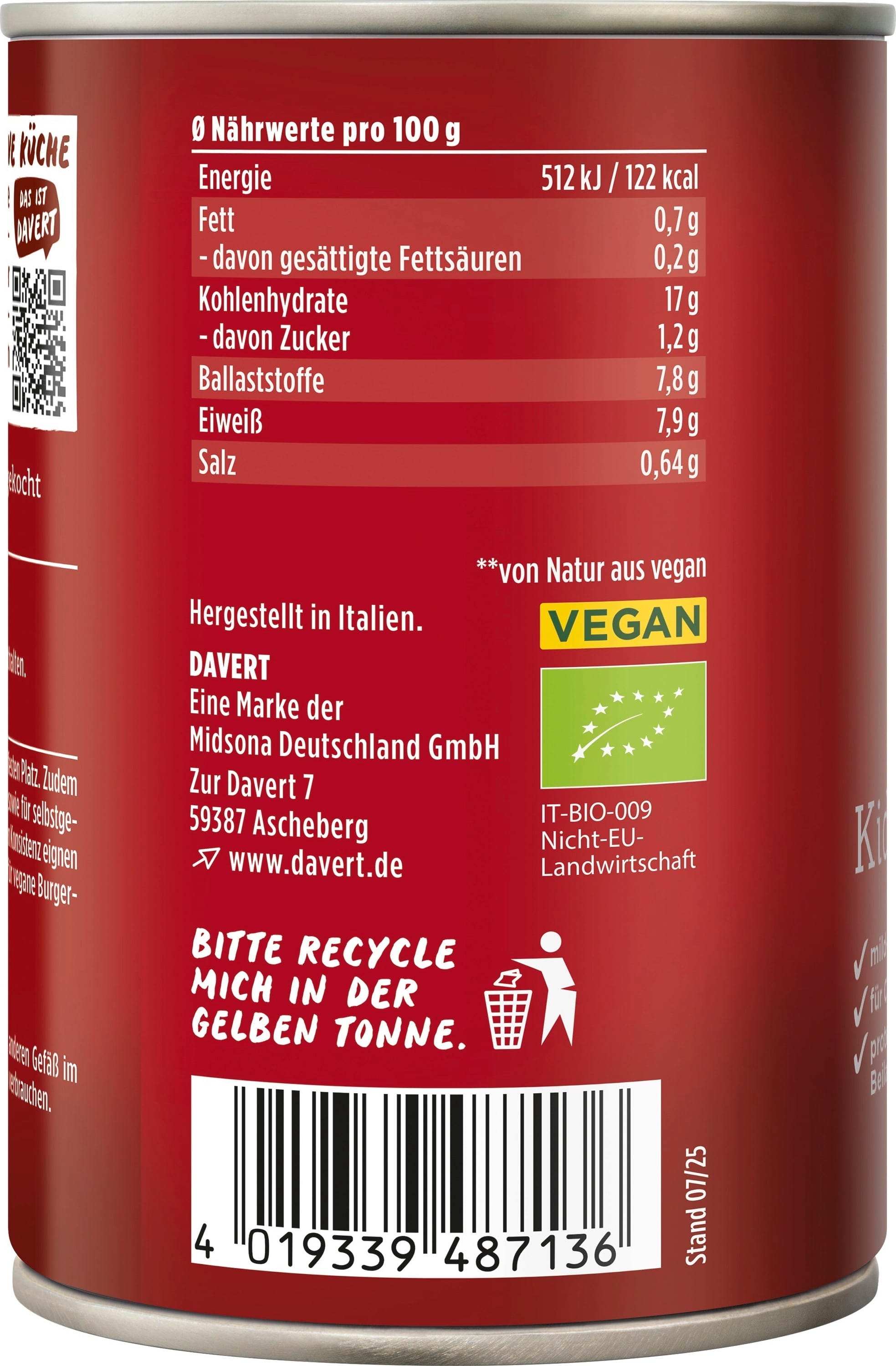 | Lagerhinweis: | Nach dem Öffnen gekühlt lagern und innerhalb von wenigen Tagen verbrauchen, Kühl & trocken lagern |