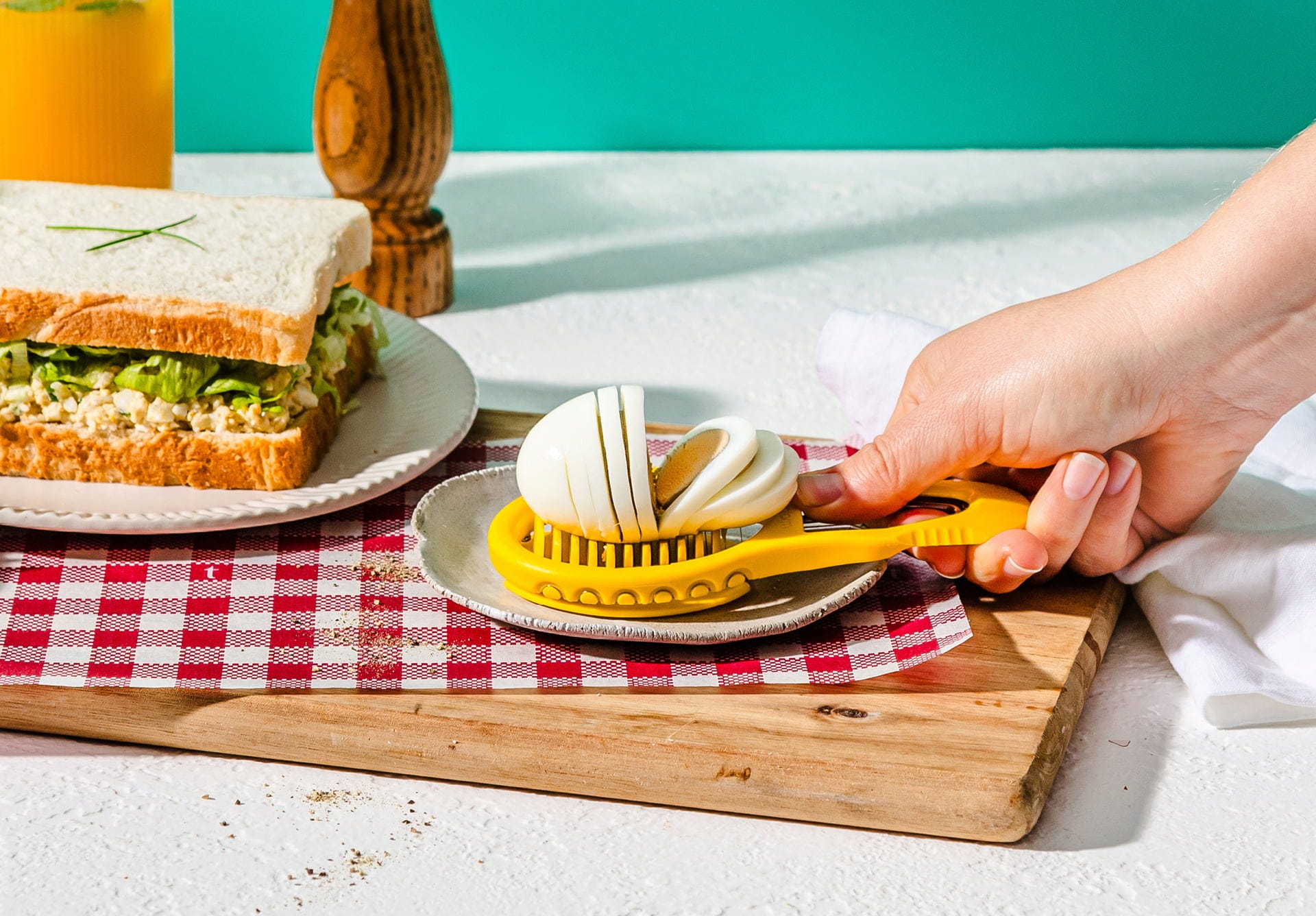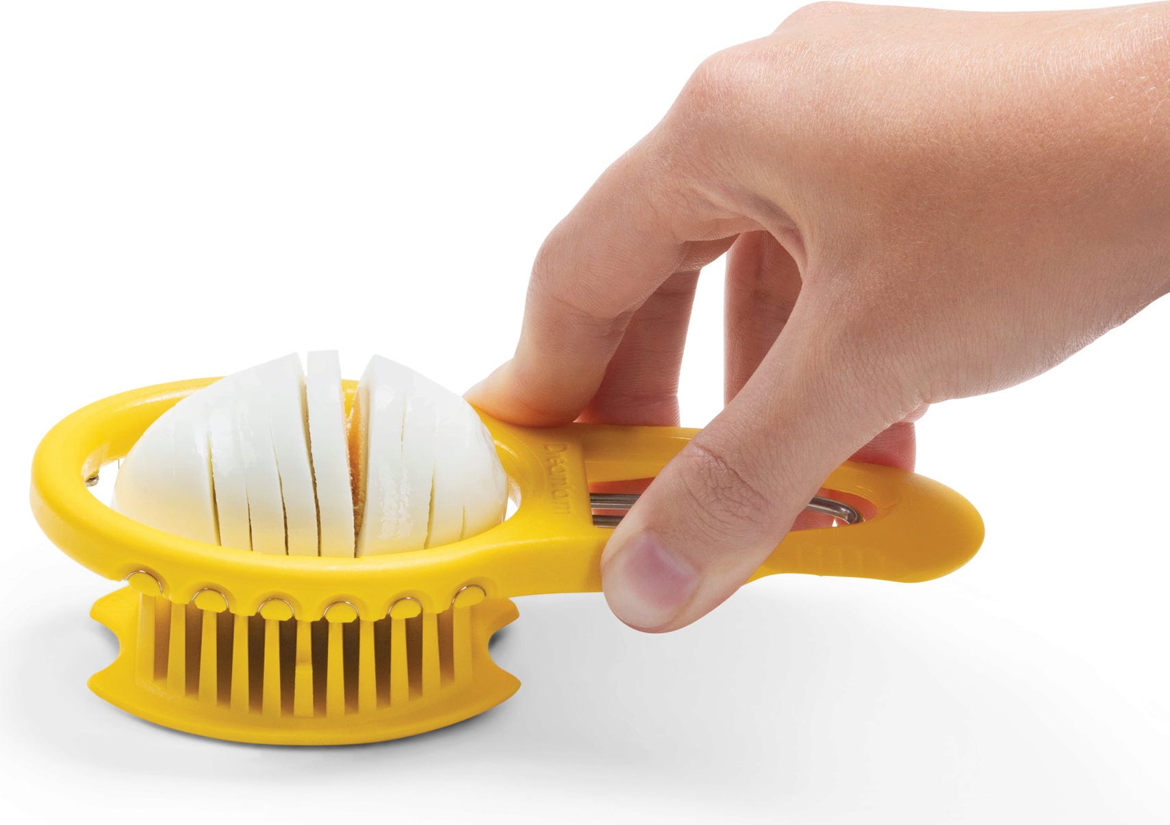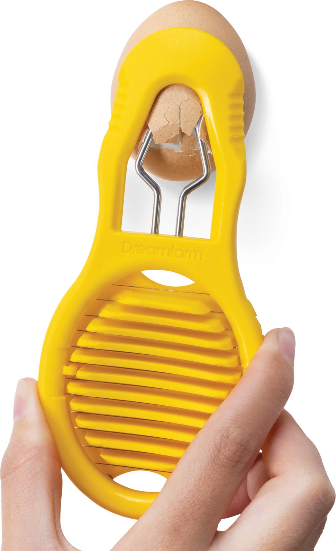 Mit dem Eierschäler & -teiler Eggler von Dreamfarm wird das Zubereiten von hartgekochten Eiern zum sauberen Vergnügen in nur drei Schritten. Zuerst knackst du die Schale präzise mit dem integrierten Crackteiler auf, woraufhin die flexible Silikonkante die Schale sanft und ohne lästige Rückstände vom Ei löst. Sobald das Ei geschält ist, zauberst du mit dem hochwertigen Edelstahl-Schneidring im Handumdrehen gleichmäßige, dekorative Scheiben für dein Sandwich oder den Salat! Zudem ist der Eggler wunderbar robust sowie platzsparend.