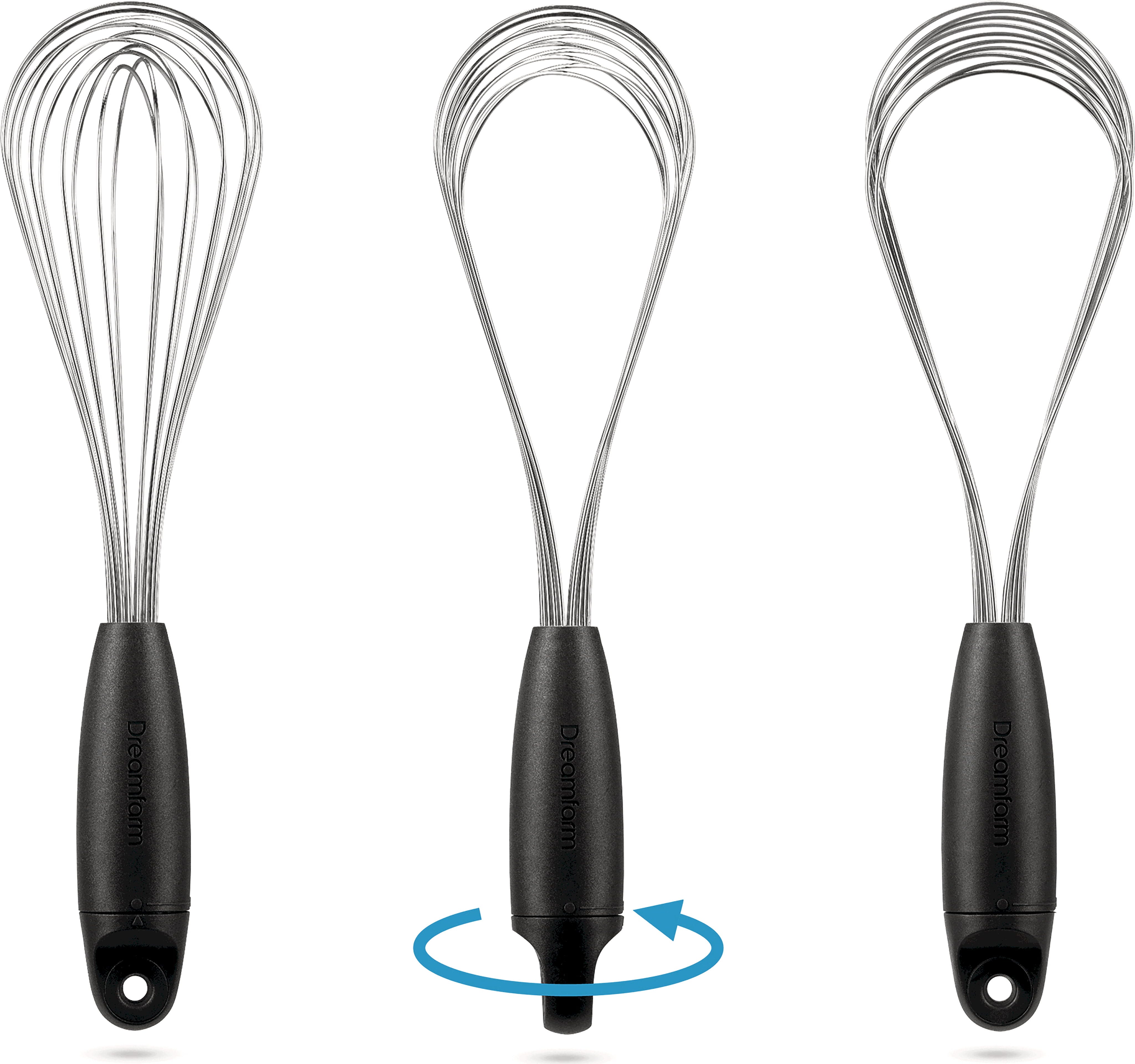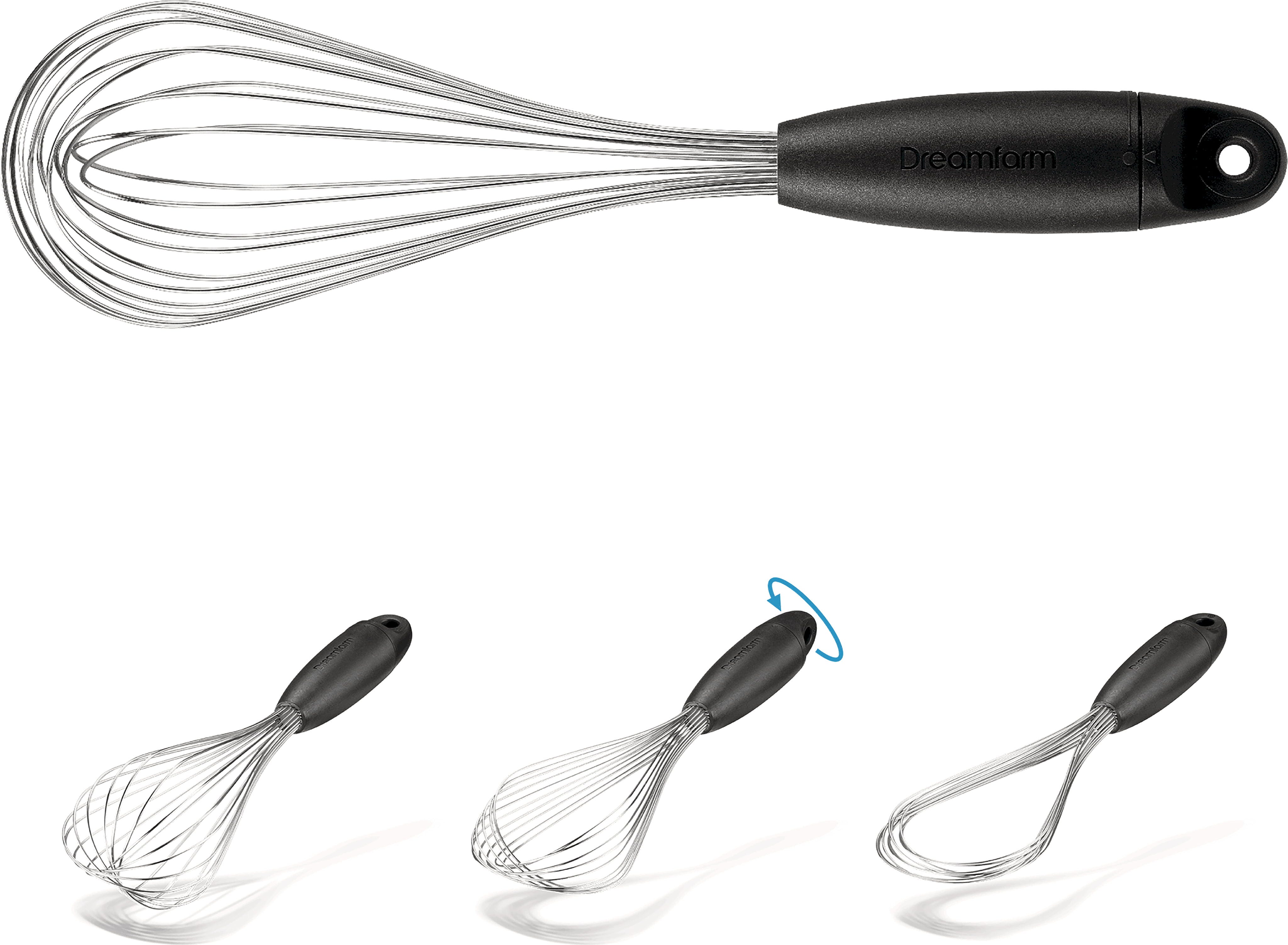 Der Schneebesen Flisk von Dreamfarm ist ein innovativer Schneebesen, der sich durch einfaches Drehen am Griff in drei verschiedene Formen verwandelt. In der Ballon-Einstellung schlägst du Sahne luftig auf, während die flachere Sauce-Einstellung ideal zum Binden und Ablöschen in flachen Pfannen ist. Nach dem Kochen lässt er sich komplett flach zusammenfalten, was ihn extrem platzsparend in deiner Besteckschublade macht und verhindert, dass er sich mit anderen Utensilien verhakt!