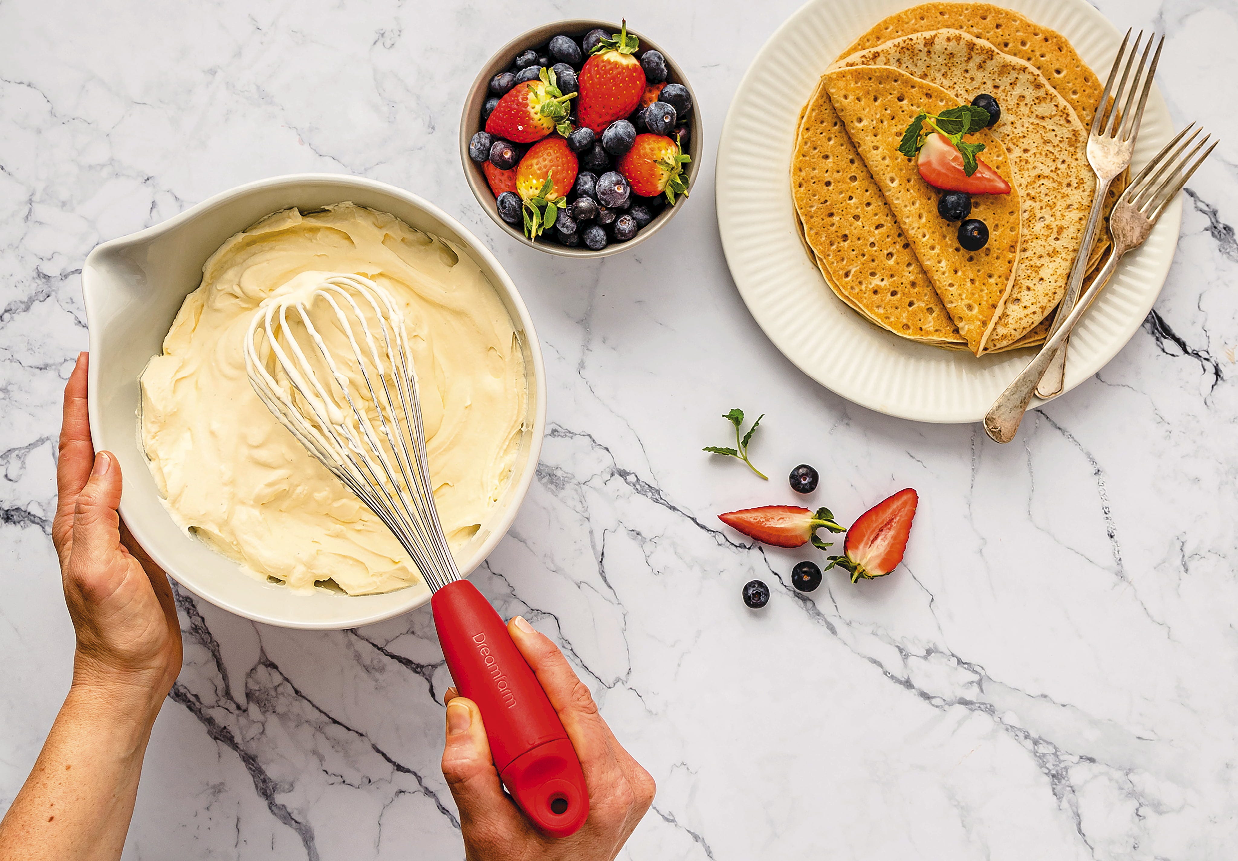 Der Schneebesen Flisk von Dreamfarm ist ein innovativer Schneebesen, der sich durch einfaches Drehen am Griff in drei verschiedene Formen verwandelt. In der Ballon-Einstellung schlägst du Sahne luftig auf, während die flachere Sauce-Einstellung ideal zum Binden und Ablöschen in flachen Pfannen ist. Nach dem Kochen lässt er sich komplett flach zusammenfalten, was ihn extrem platzsparend in deiner Besteckschublade macht und verhindert, dass er sich mit anderen Utensilien verhakt!
