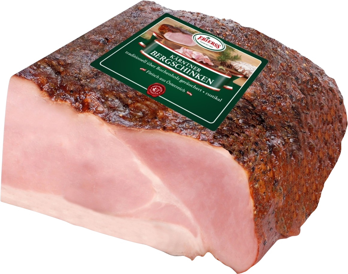 Für den rustikalen Kärntner Bergschinken von Frierss veredeln die Schinkenmeister nur sorgfältig ausgesuchtes Qualitätsfleisch heimischer Schweine, das speziell zugeschnitten wird. Das Geheimnis dieser Schinkenspezialität liegt in der besonderen Gewürzmischung - ein gut gehütetes Familienrezept. Über naturbelassenem Buchenholz geräuchert, wird der Schinken nach bewährtem Kochverfahren am Punkt gegart. Dies verleiht ihm seine besondere Saftigkeit und Zartheit im Biss. Charakteristisch sind sein rustikaler Zuschnitt und seine traditionell gewürzte Oberfläche mit grob gehackten Gewürzen, die ihm seinen feinwürzigen Geschmack rustikaler Note verleihen.