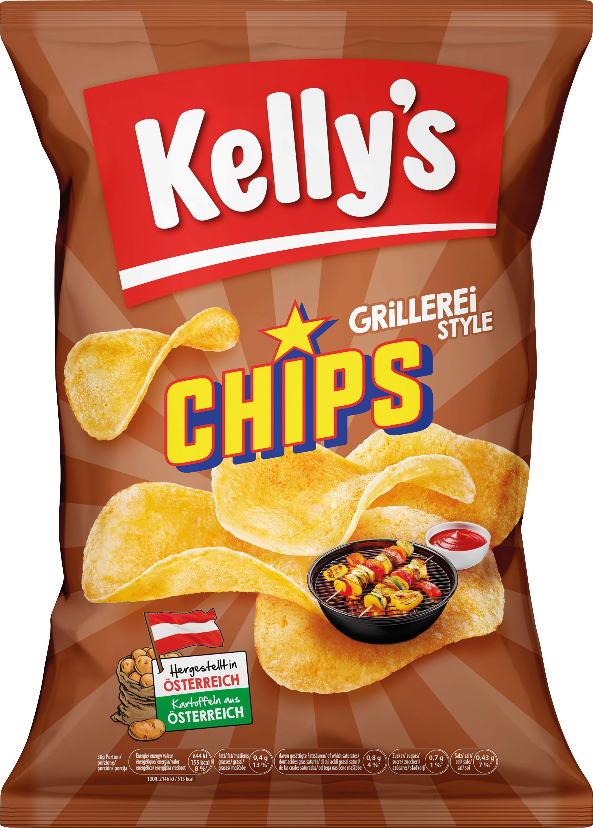 100 % österreichische Kartoffeln, Salz aus den heimischen Alpen, hochwertige Gewürze und der Verzicht auf Geschmacksverstärker machen Kelly's Chips zum idealen Snackgenuss! Entdecke jetzt die neueste Geschmacksrichtung "Grillerei Style", die mit ihrem rauchigen, süßen BBQ-Geschmack garantiert überzeugen wird!