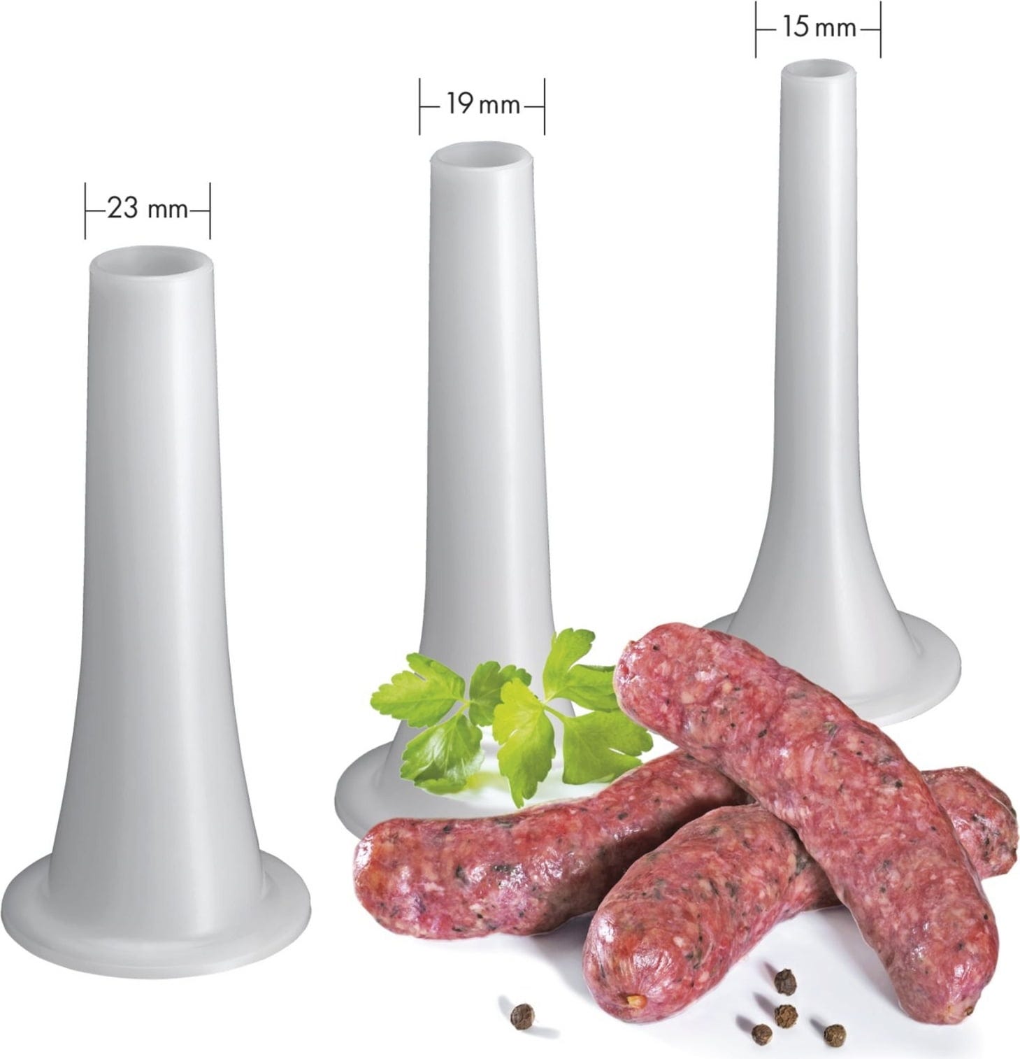 Lieferumfang: Fleischwolf, 3 Lochscheiben aus Messerstahl (2/ 4,5/ 6 mm), 3 Wurstaufsätze (15/ 19/ 23 mm), Spritzgebäckvorsatz (4 verschiedene Formen)