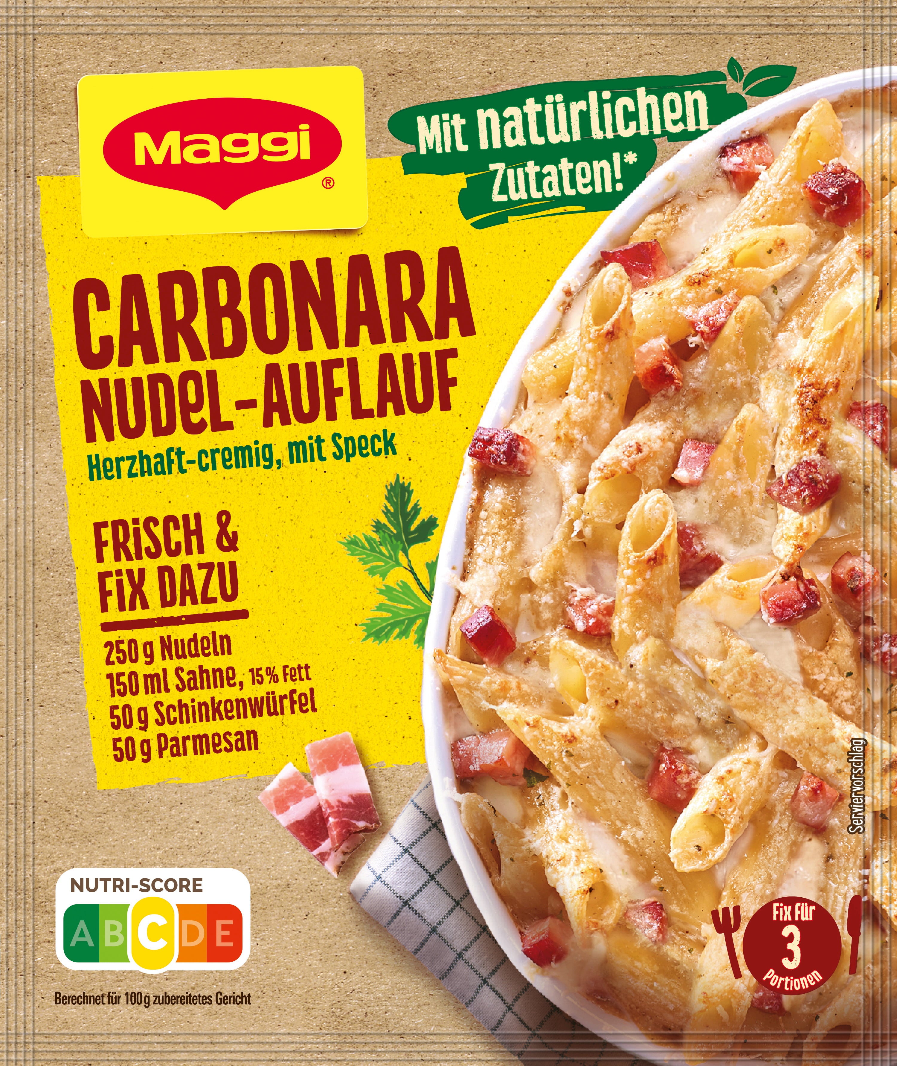 Mit dieser Maggi Gewürzmischung für einen cremigen Carbonara Nudel-Auflauf zauberst du im Nu ein warmes, herzhaftes Ofengericht, das der ganzen Familie schmeckt. Die Kombination aus geräucherten Speckstückchen und würzigem Käse sorgt für köstliche, pikante Geschmacksaromen. Ein Gericht, das immer gelingt und immer gut ankommt – ideal für den Alltag oder das gemütliche Wochenende.