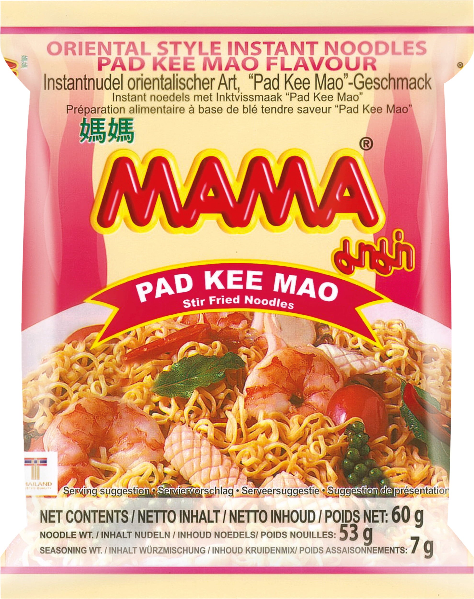 Die Instant-Nudeln der Marke MAMA in der Variante „Pad Kee Mao“ bringen dir die klassische thailändische Geschmackskombination aus Chili, Knoblauch und Basilikum – angenehm scharf und aromatisch zugleich. Die feinen Nudeln nehmen die kräftige Würze schnell auf und sind in nur wenigen Minuten zubereitet – besonders praktisch für eine schnelle Mahlzeit mit asiatischem Touch.