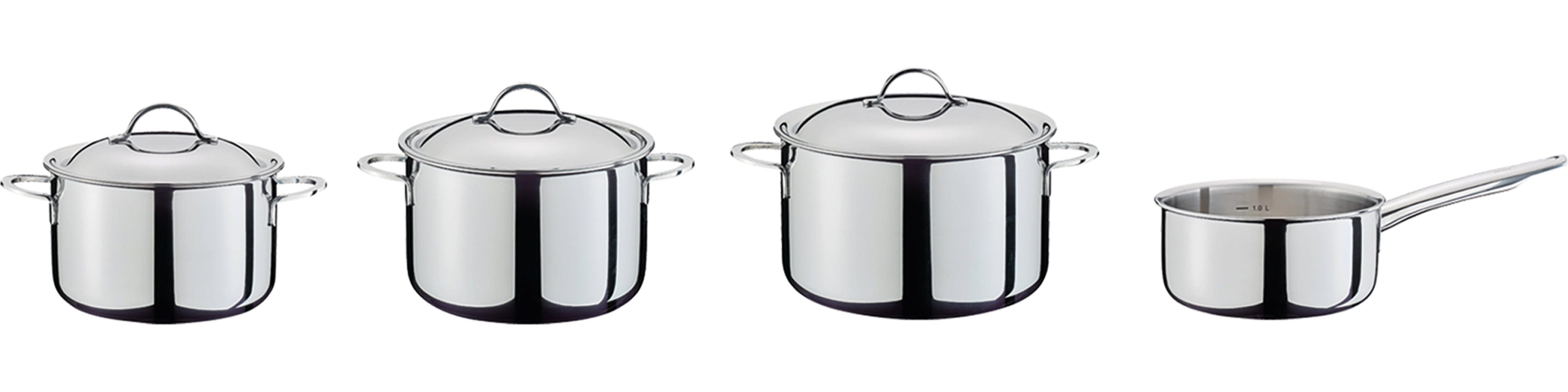 Dank des hochglanzpolierten Edelstahls und des geringen Gewichts eignen sich die Töpfe auch hervorragend als elegantes Serviergeschirr direkt auf dem Tisch. Der speziell geschlossene Topfrand verhindert Korrosion und garantiert eine lebenslange Beständigkeit. Ob punktgenaues Ausgießen ohne Kleckern oder das Kochen mit wenig Wasser dank passgenauer Deckel – dieses Set ist die perfekte Kombination aus Tradition und moderner Funktionalität!