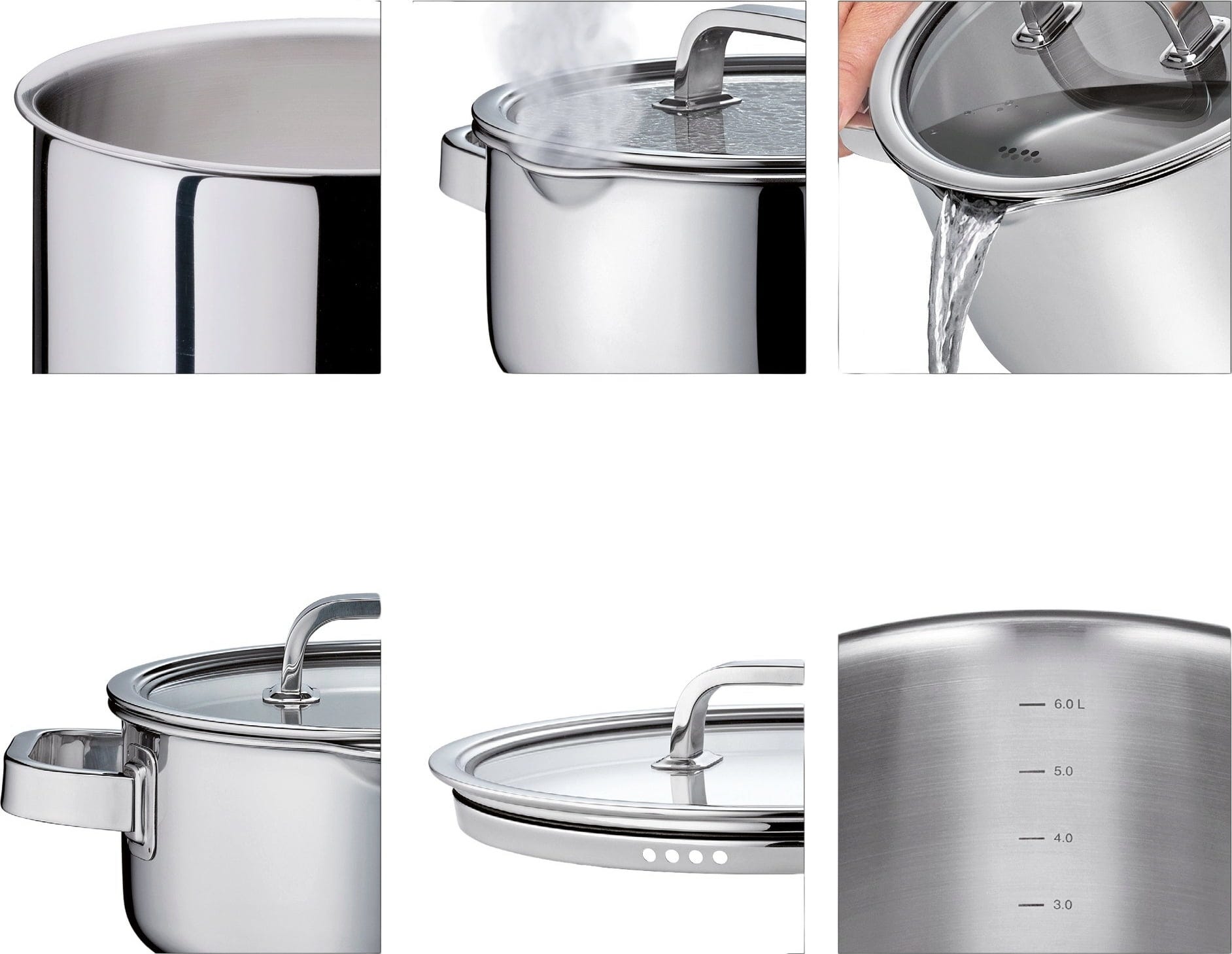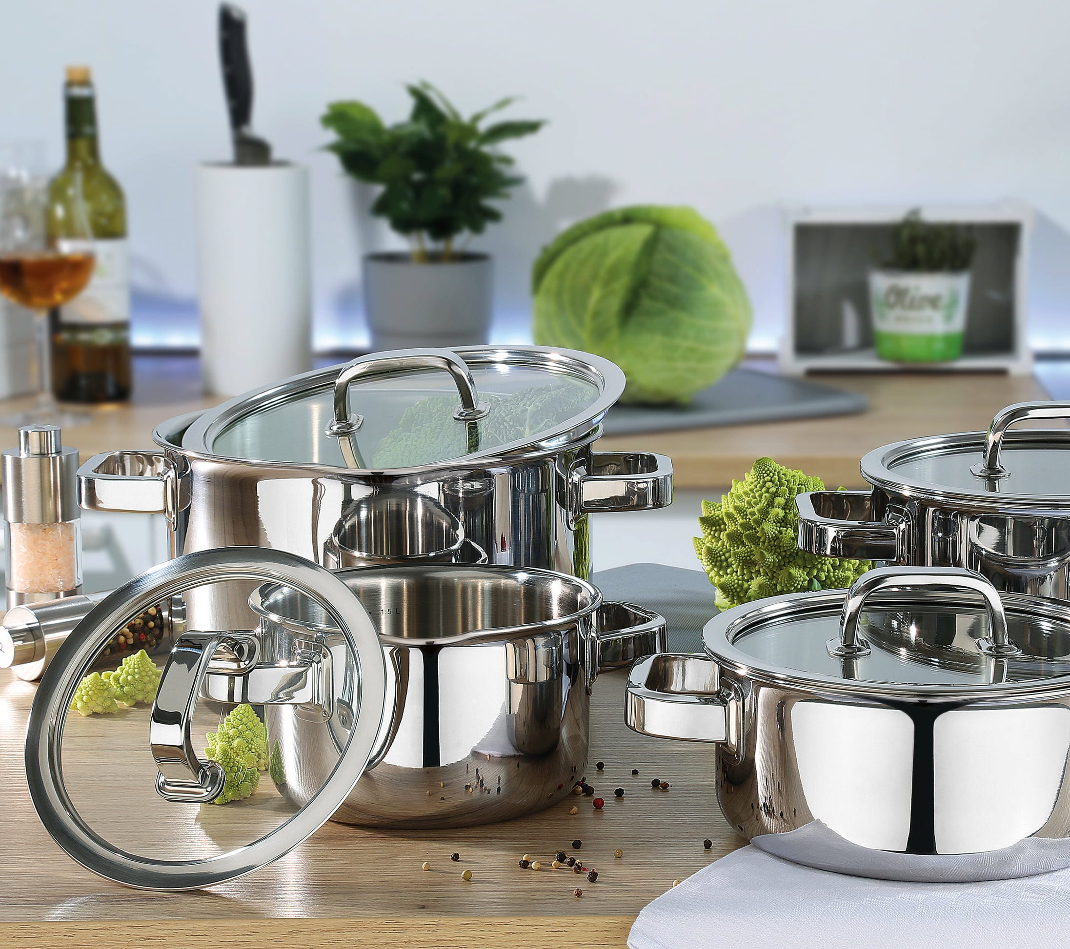 Die robusten Glasdeckel mit Silikondichtung schließen perfekt ab, sodass du deine Kreationen beim vitaminschonenden Garen immer im Blick hast. Dank der praktischen Innenskala und der speziellen Schüttmulde für kleckerfreies Ausgießen geht dir die Arbeit federleicht von der Hand. Ob auf Induktion, Gas oder Elektro – dieses 5-teilige Set bietet dir vom kompakten 2-Liter-Topf bis zum großzügigen 6,5-Liter-Modell die perfekte Basis für jedes Menü. Nach dem Festschmaus übernimmt einfach die Spülmaschine die Arbeit.
