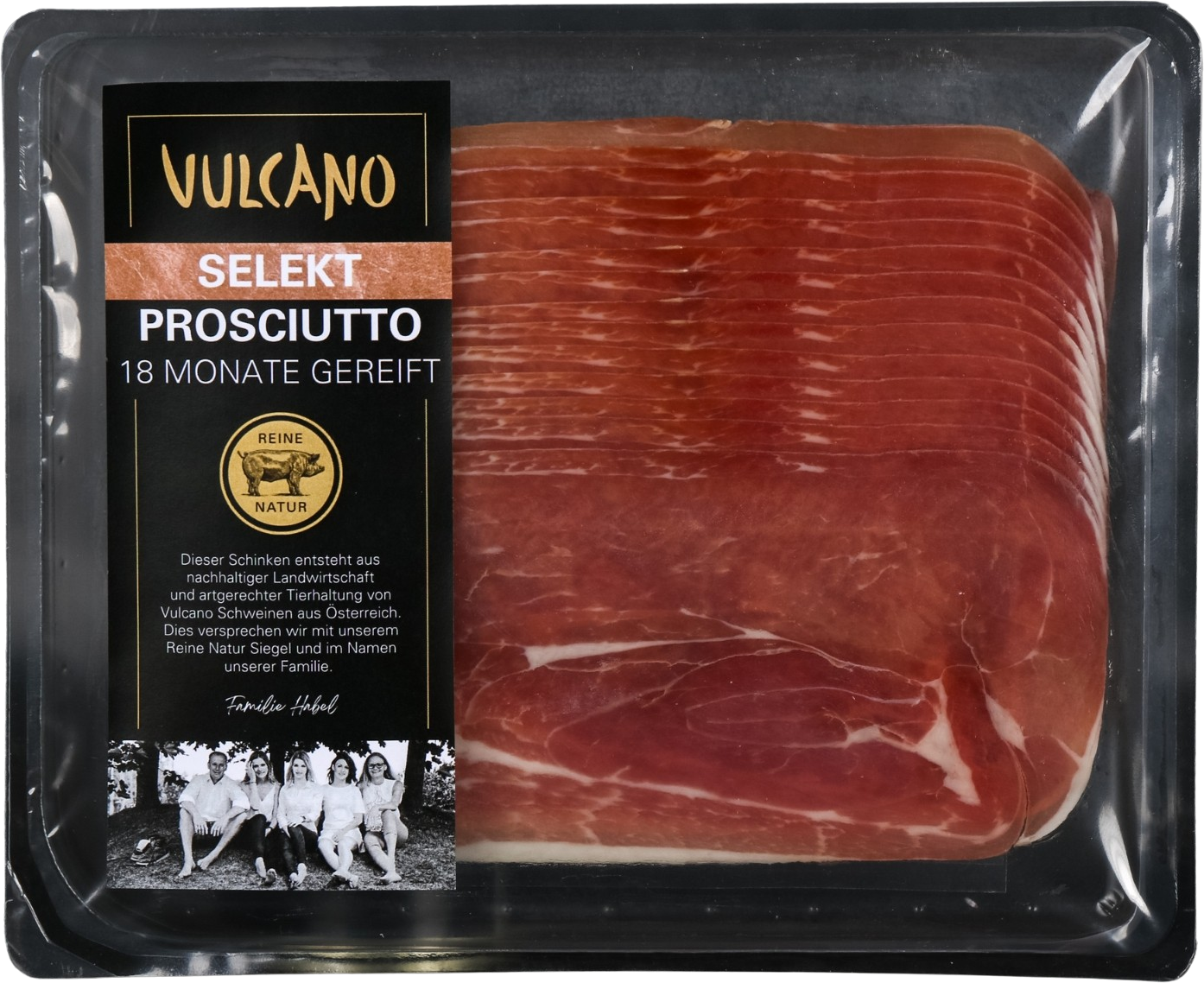 Bestes Fleisch, meisterhaftes Handwerk und viel Zeit: Dank dieser Eckpfeiler in der Herstellung feiner Rohschinken erreicht Vulcano unvergleichliche Aromen, die selbst anspruchsvollste Feinkostianer ins Schwärmen bringen. Der Prosciutto durfte 18 Monate reifen und wurde ausschließlich mit natürlichen Zutaten veredelt. Die Spezialität kommt bereits fein aufgeschnitten ins Haus, servierbereit für Familie und Gäste. Herzhaft und erlesen, direkt aus dem steirischen Vulkanland, einem Hotspot österreichischer Schmankerl-Kulinarik!