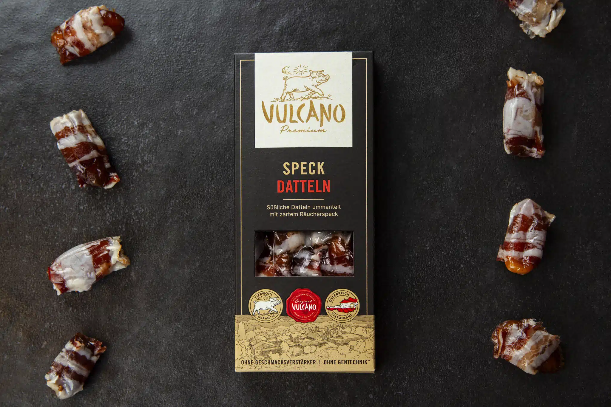 Getrocknete Datteln werden mit zartem, leicht geräuchertem Speck ummantelt. Diese Speckfrüchte eigenen sich sehr gut als kleine Jause zwischendurch, zum roh-essen aber auch cross gebraten zu Salaten, Chutneys oder allein als Vorspeise.