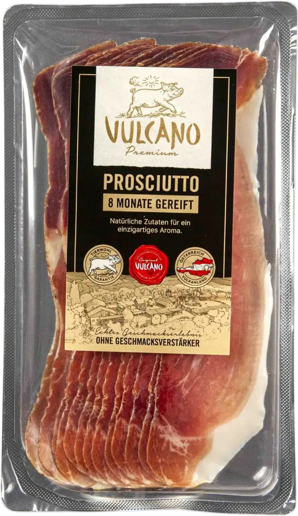 Der luftgetrocknete Vulcano Prosciutto sorgt für ein köstliches Geschmackserlebnis. Hauchdünn geschnitten zergeht dieser Rohschinken fast von selbst auf der Zunge. Ideal als Vorspeise in Kombination mit Honigmelone, Salaten oder auf Kräuterbaguettes. Oder einfach zum herzhaften Bauernbrot mit Butter genießen. Ein wahres Schinken-Highlight für Feinschmecker!