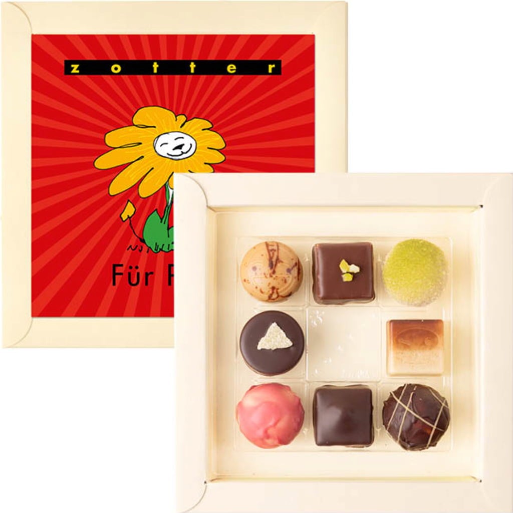 Beschenke deinen Papa mit diesem schokoladigen Biofekt-Set von Zotter. Die Packung enthält 8 verschiedene Pralinen, die mit herzhaften, teilweise alkoholhaltigen Cremefüllungen gefüllt sind.