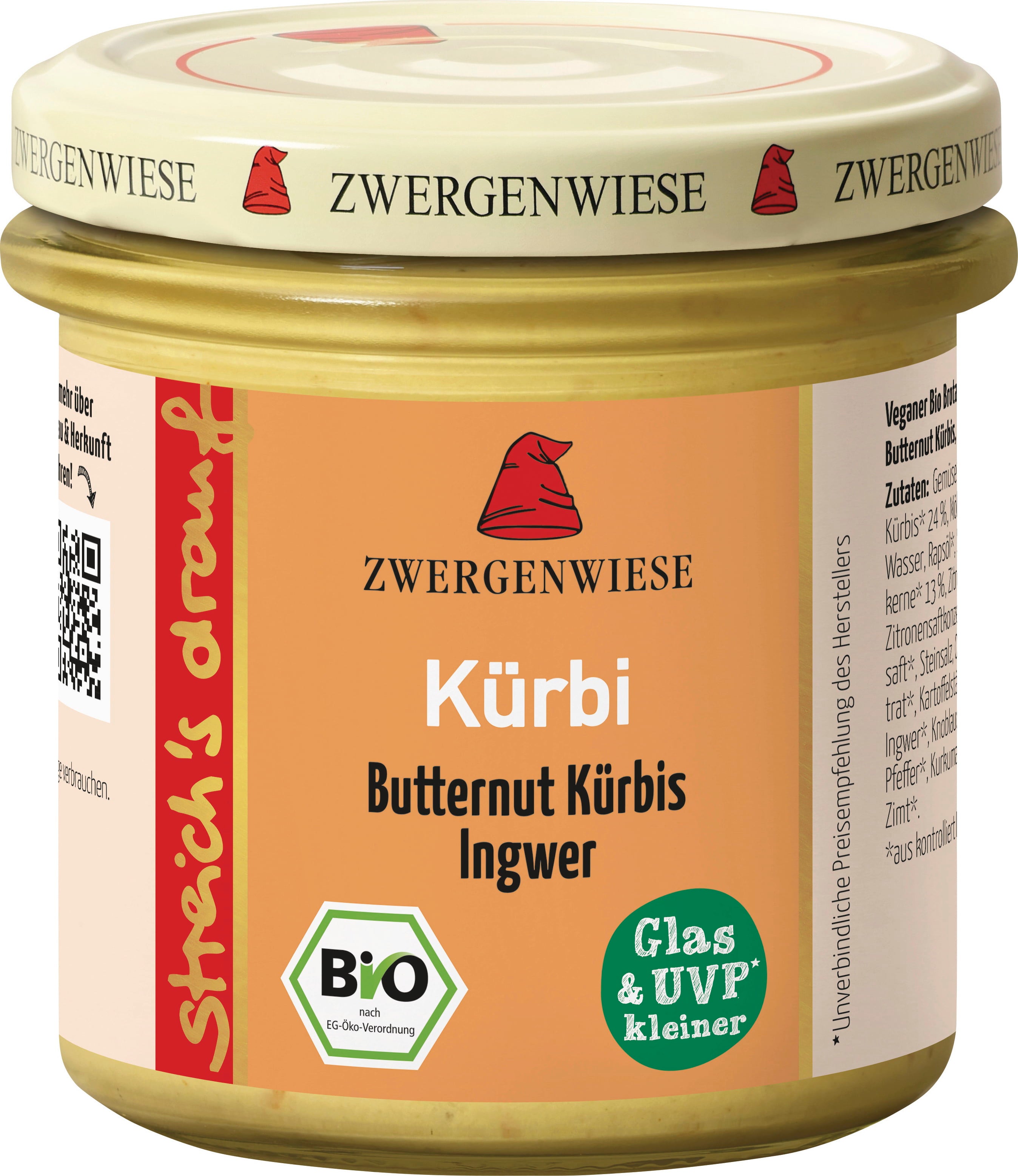 Der Bio streich´s drauf Kürbi von Zwergenwiese ist ein cremiger Brotaufstrich aus Sonnenblumenkernen, mit Butternuss-Kürbis und Ingwer verfeinert. Aus der Kombination der nussigen Sonenblumenkerne, mildem, leicht süßlichem Butternuss-Kürbis und leicht scharfem Ingwer ergibt sich ein intensiv würziges und doch ausgewogenes Aroma.