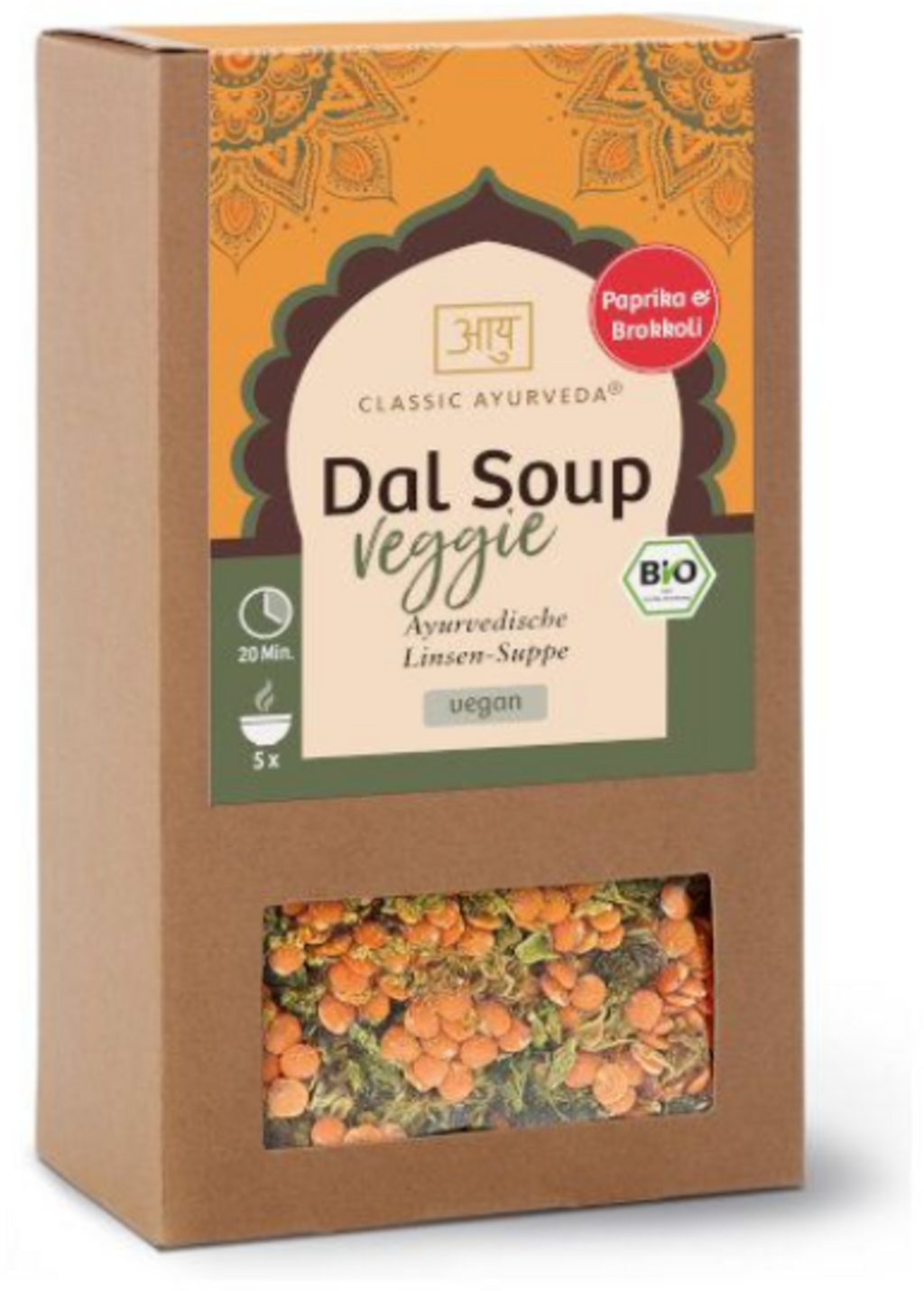 Le dal est une soupe de lentilles qui, dans cette version au goût délicat, associe des lentilles rouges à des légumes bio sélectionnés tels que le brocoli, le paprika et les tomates. Des copeaux de noix de coco, des dattes et des raisins secs apportent une note douce et harmonieuse à la recette, tandis que des épices traditionnelles comme le cumin, le curcuma et le gingembre viennent compléter la composition. Le mélange est sans arômes artificiels ni conservateurs et constitue une base complète pour une alimentation végétale. Particulièrement adapté comme repas léger le soir ou comme composant dans le cadre du jeûne intermittent ayurvédique.