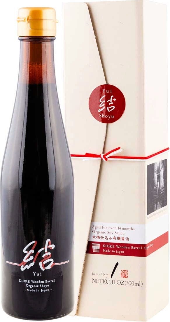 Yui est une sauce soja Koikuchi classique, certifiée biologique, en provenance du Japon. Elle est fermentée pendant 14 à 18 mois dans des fûts en bois traditionnels (*Kioke*) et livrée dans un coffret cadeau raffiné. Chaque bouteille porte le numéro de son fût de maturation – une pièce unique destinée aux véritables amateurs.
