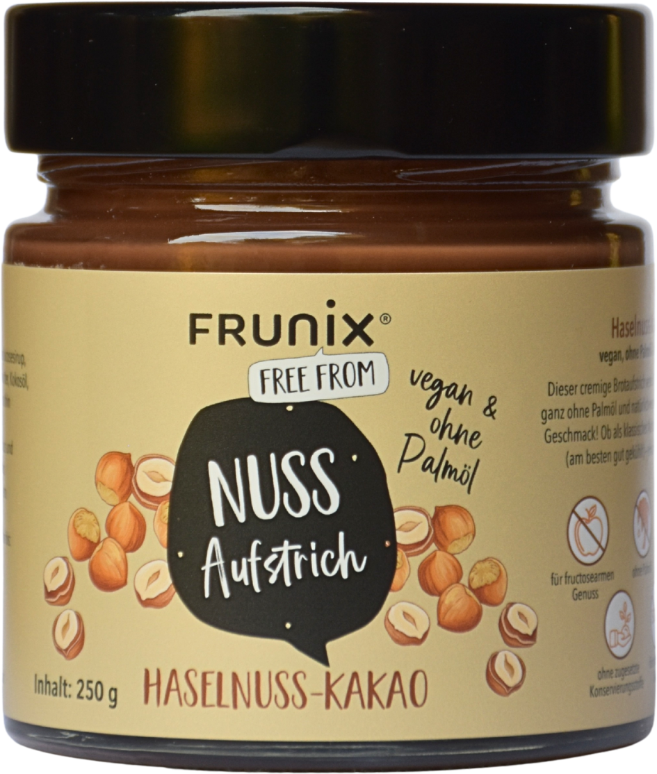 Avec cette pâte à tartiner de FRUNIX, le pain se transforme en un véritable moment de gourmandise, le tout sans huile de palme. Sa teneur de 35 % en noisettes lui confère une texture merveilleusement onctueuse qui fond en bouche, tandis que le cacao de qualité vient parfaire l’ensemble. La recette a été spécialement élaborée avec une faible teneur en fructose et convient parfaitement à une alimentation consciente, végétalienne et/ou sans gluten.