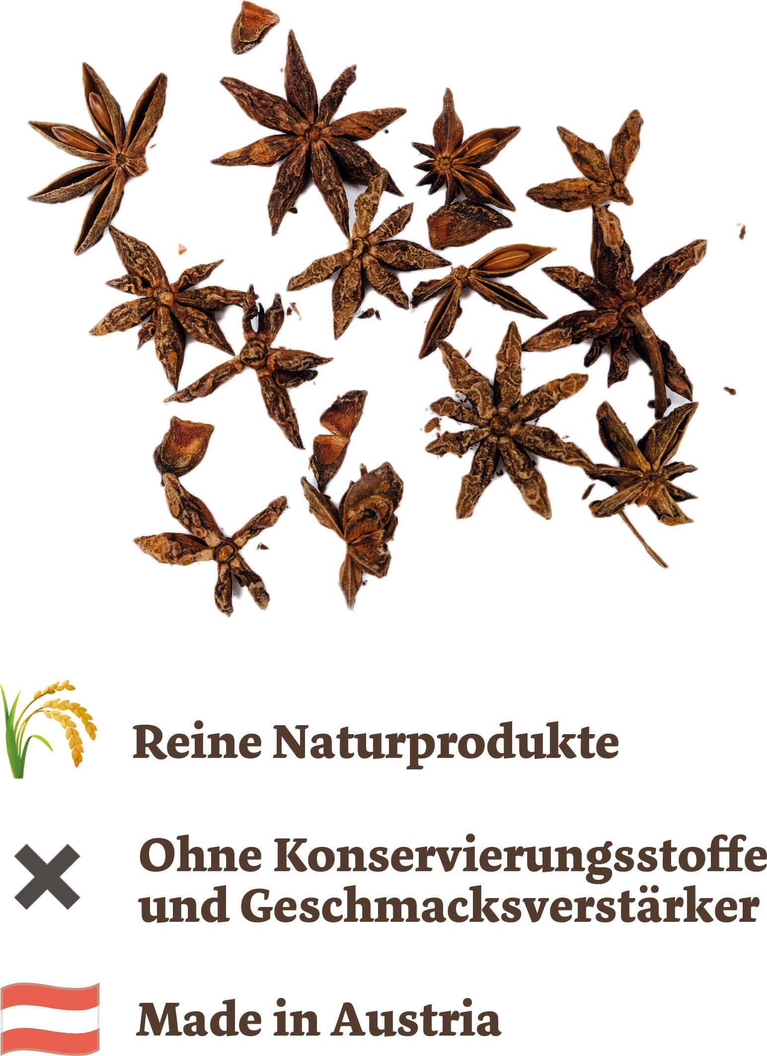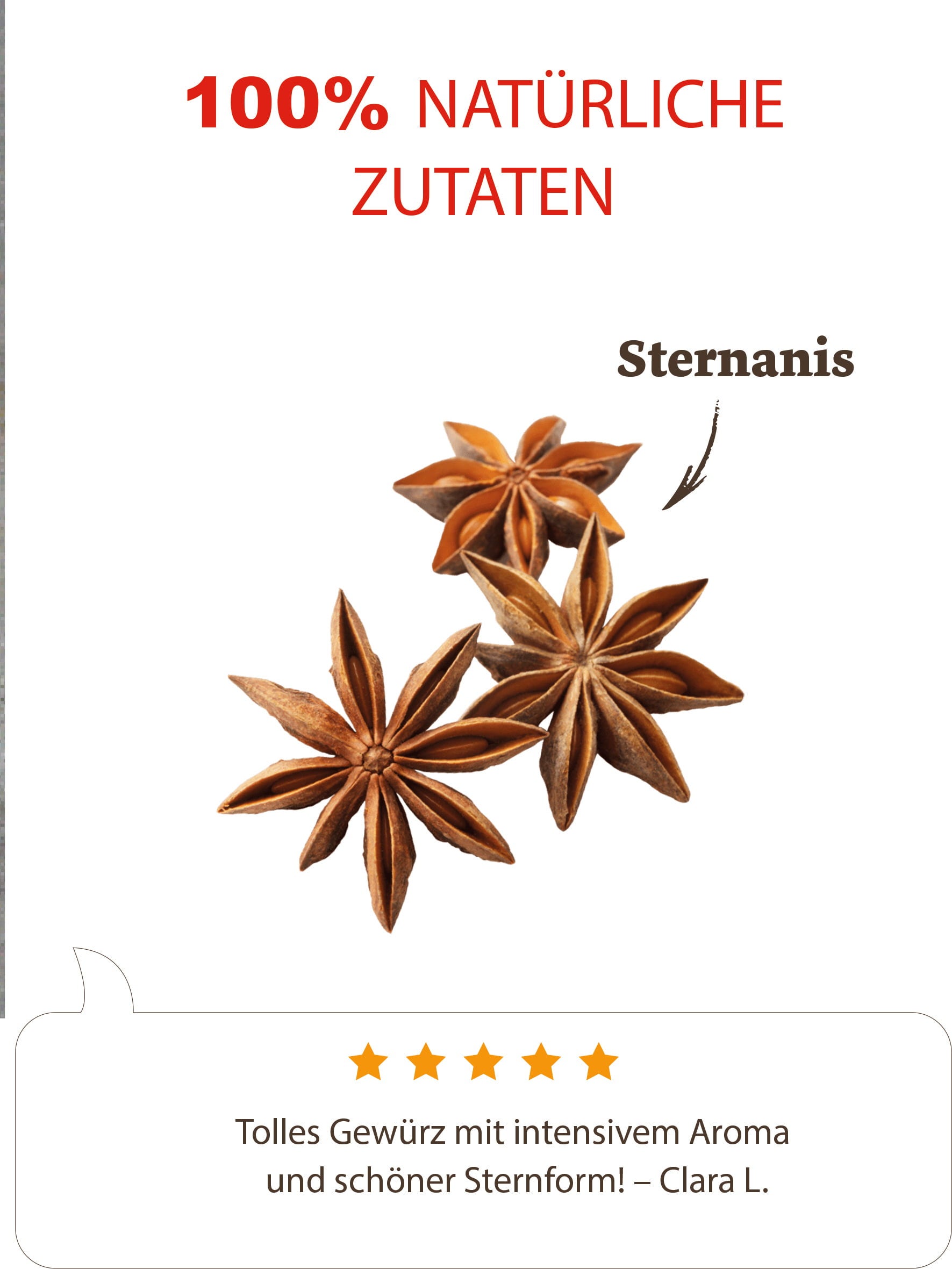 L'anis étoilé est une épice qui convient aussi bien à la préparation de plats salés que sucrés. Il est particulièrement apprécié pendant la période de Noël, non seulement pour son arôme caractéristique, mais aussi pour sa forme étoilée spectaculaire. L'anis étoilé doux et aromatique donne aux aliments et aux boissons une note unique. Il est utilisé notamment pour les plats de viande ou de poisson, les soupes, les sauces, les confitures, les thés, les desserts et les compotes.