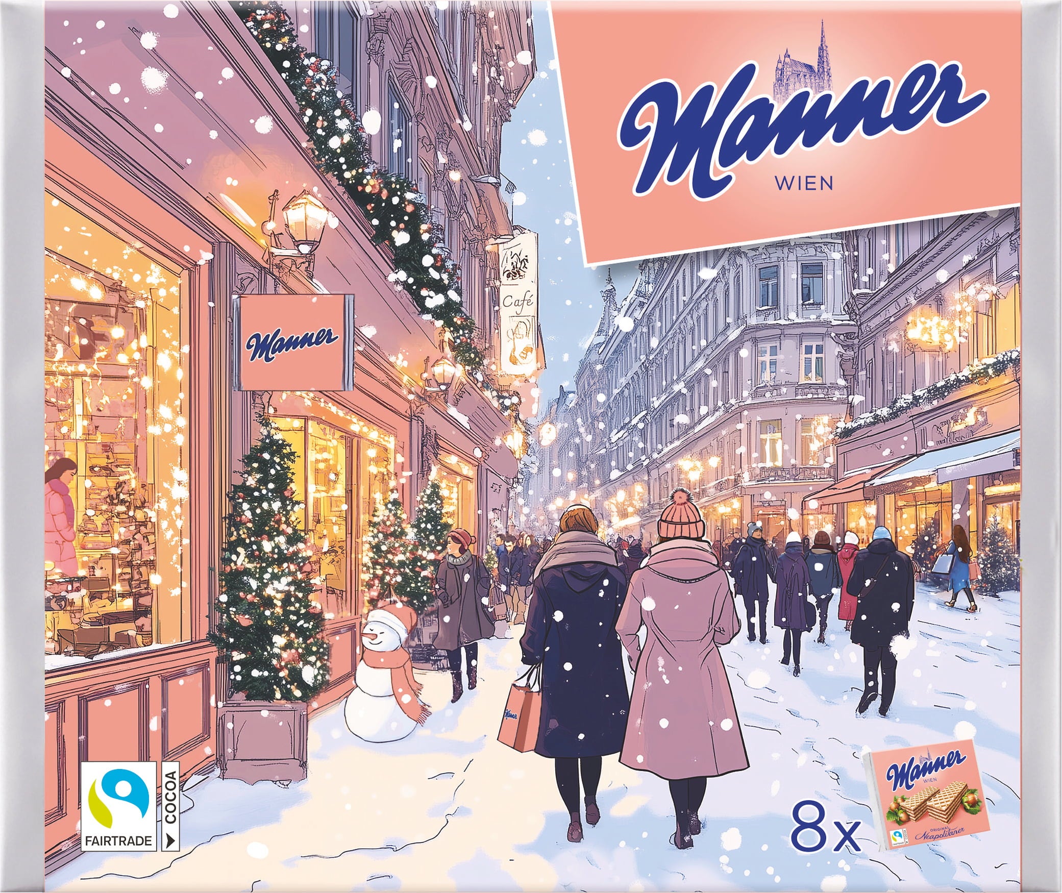 Le cadeau parfait pour tous les fans de Manner : les célèbres gaufrettes croustillantes, fourrées de crème cacao et noisette, dans un grand paquet aux motifs de Noël.