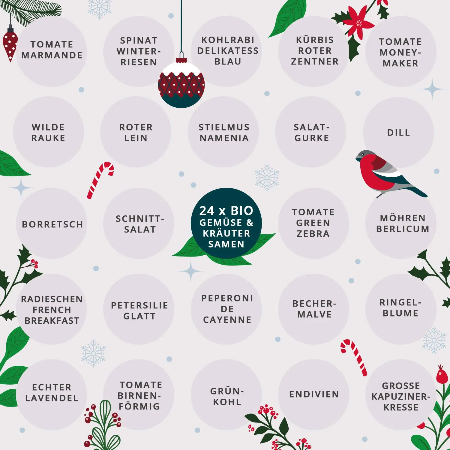 Ce calendrier de l’Avent renferme 24 variétés anciennes de légumes et d’herbes aromatiques, toutes issues de l’agriculture biologique. Un coffret idéal pour redécouvrir des plantes oubliées et pratiquer un jardinage durable. Parfait pour celles et ceux qui attachent de l’importance à la protection de l’environnement, à la biodiversité et aux saveurs authentiques.