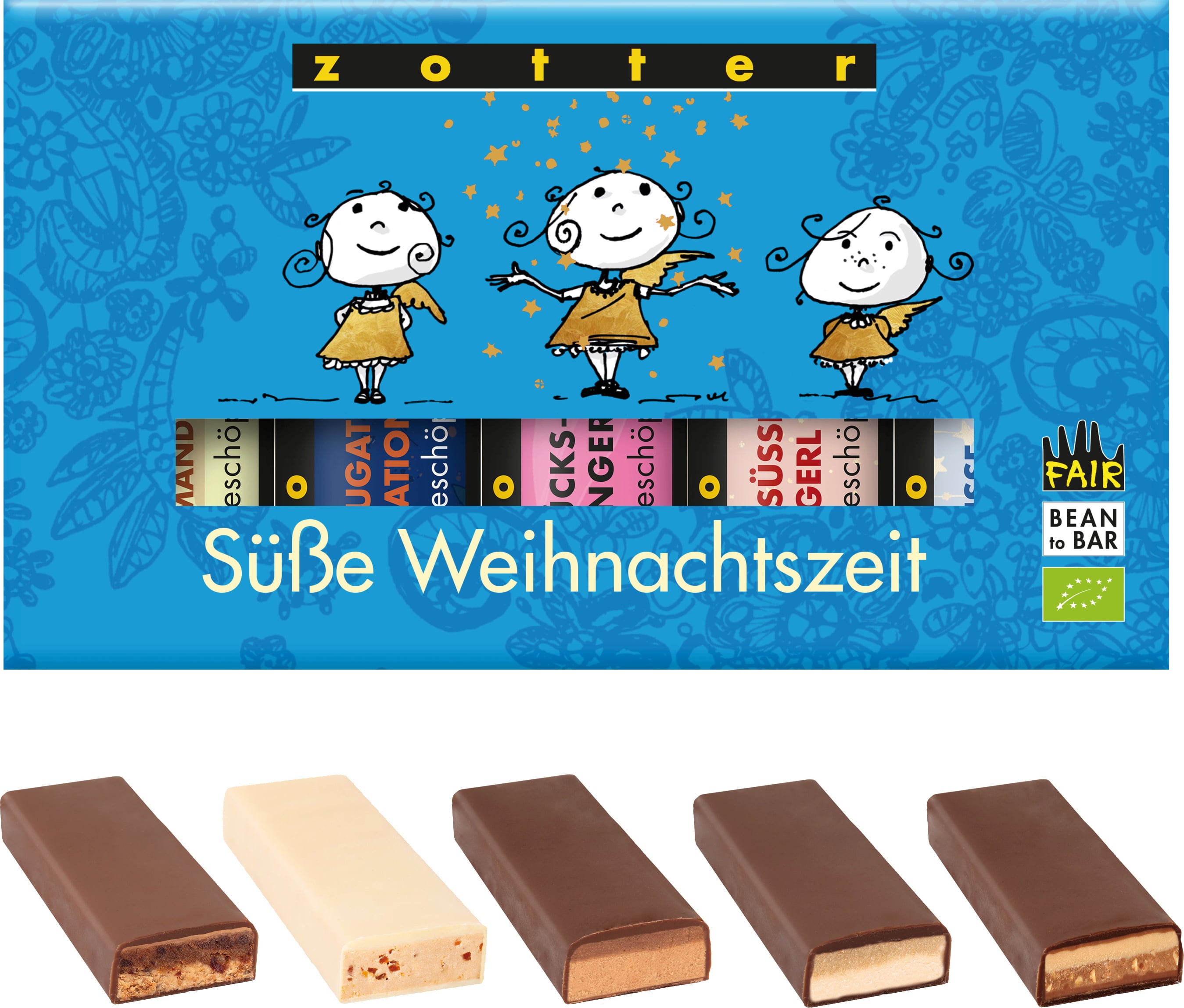 Cet adorable assortiment contient cinq mini-chocolats Zotter de 20 g emballés individuellement et faits à la main :