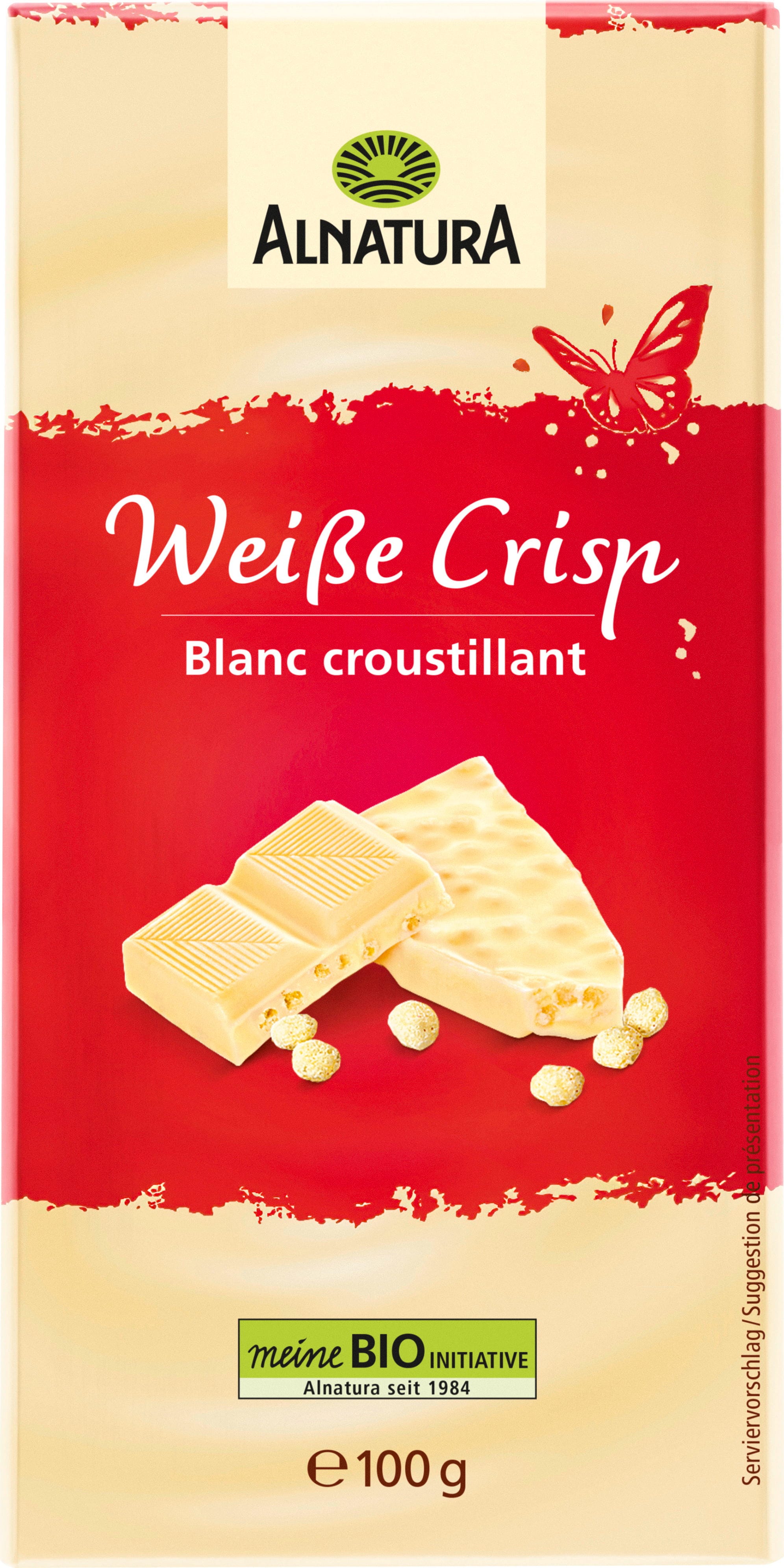 De biologische witte crisp-chocolade van Alnatura overtuigt door de combinatie van zachte witte chocolade en krokante rijstcrisps. De chocolade van biologische kwaliteit is vrij van lecithine.