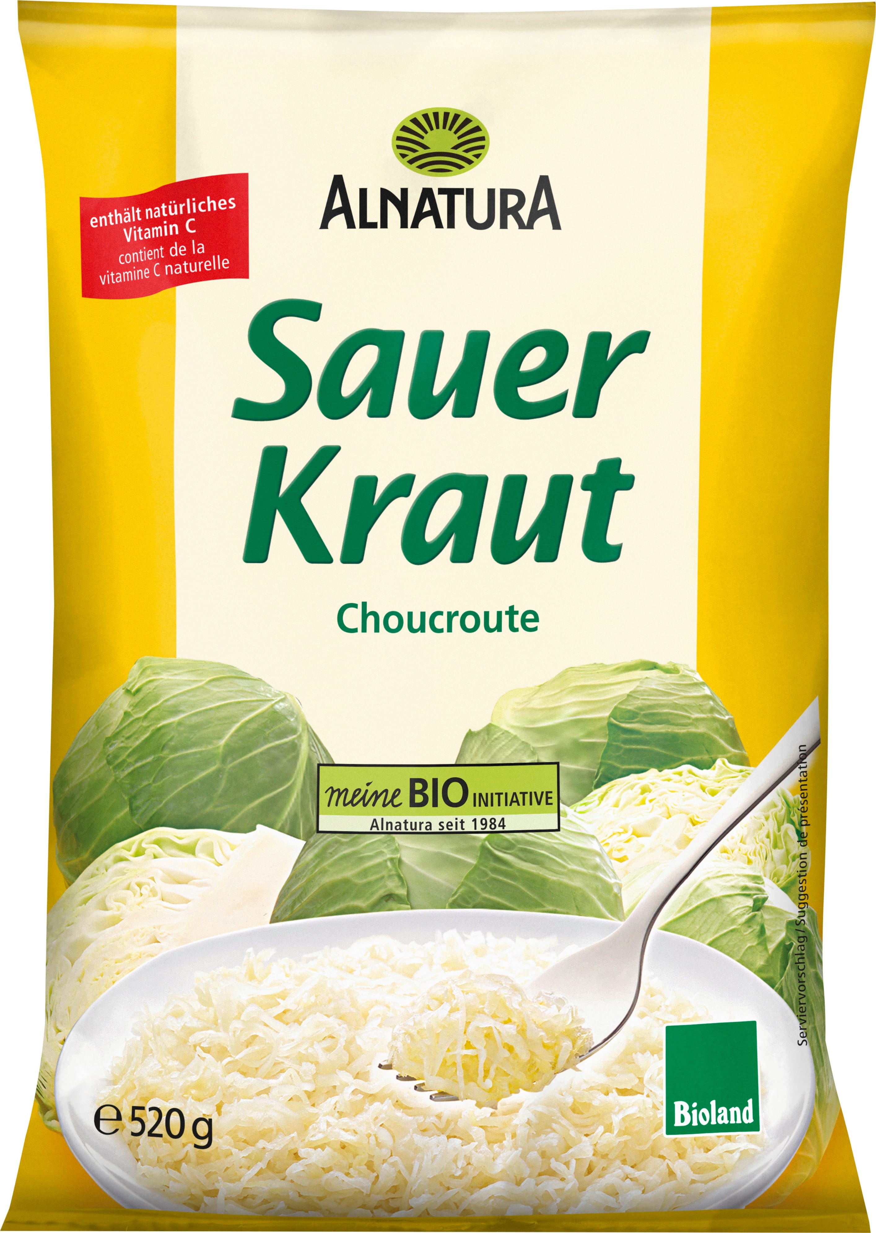 De Alnatura Bioland-zuurkool behoort tot de klassiekers van de Duitse keuken. De gebruikte witte kool wordt na de oogst fijn gesneden. Door melkzuurfermentatie wordt hij zachtjes verfijnd. De zuurkool smaakt bij elke gelegenheid - of het nu als bijgerecht of als basis voor stoofschotels en salades is.