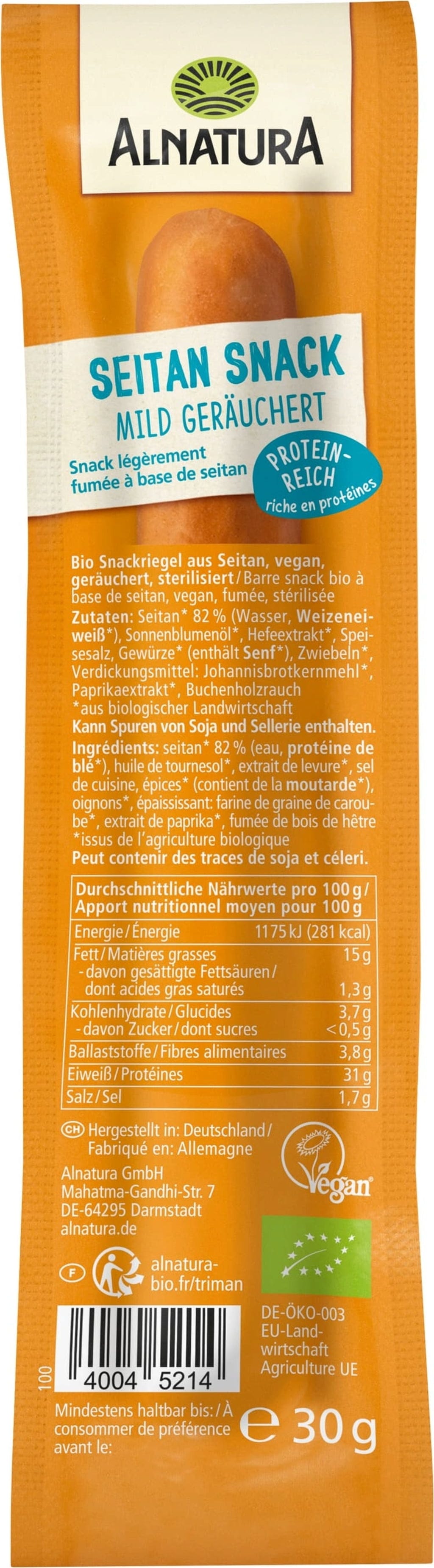 Deze veganistische snack van Alnatura is een hartig-aromatisch alternatief voor de trek tussendoor. Het product is gemaakt op basis van eiwitrijke seitan en is mild gerookt. De snack is ongekoeld houdbaar en daarom ook ideaal voor onderweg.