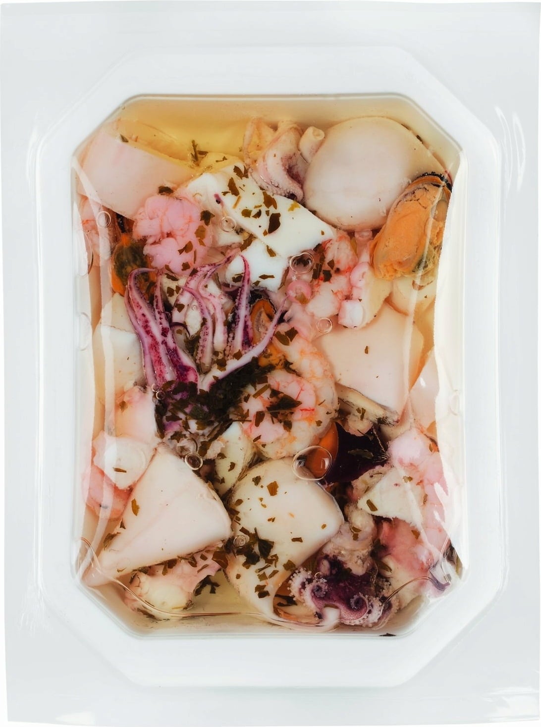 reuzeninktvis, kleine Kraken, inktvis, inktvis, mosselen, rivierkreeft, zonnebloemolie, wijnazijn, Zout, suiker, Peterselie, knoflook, citroenzuur (E330)[1]