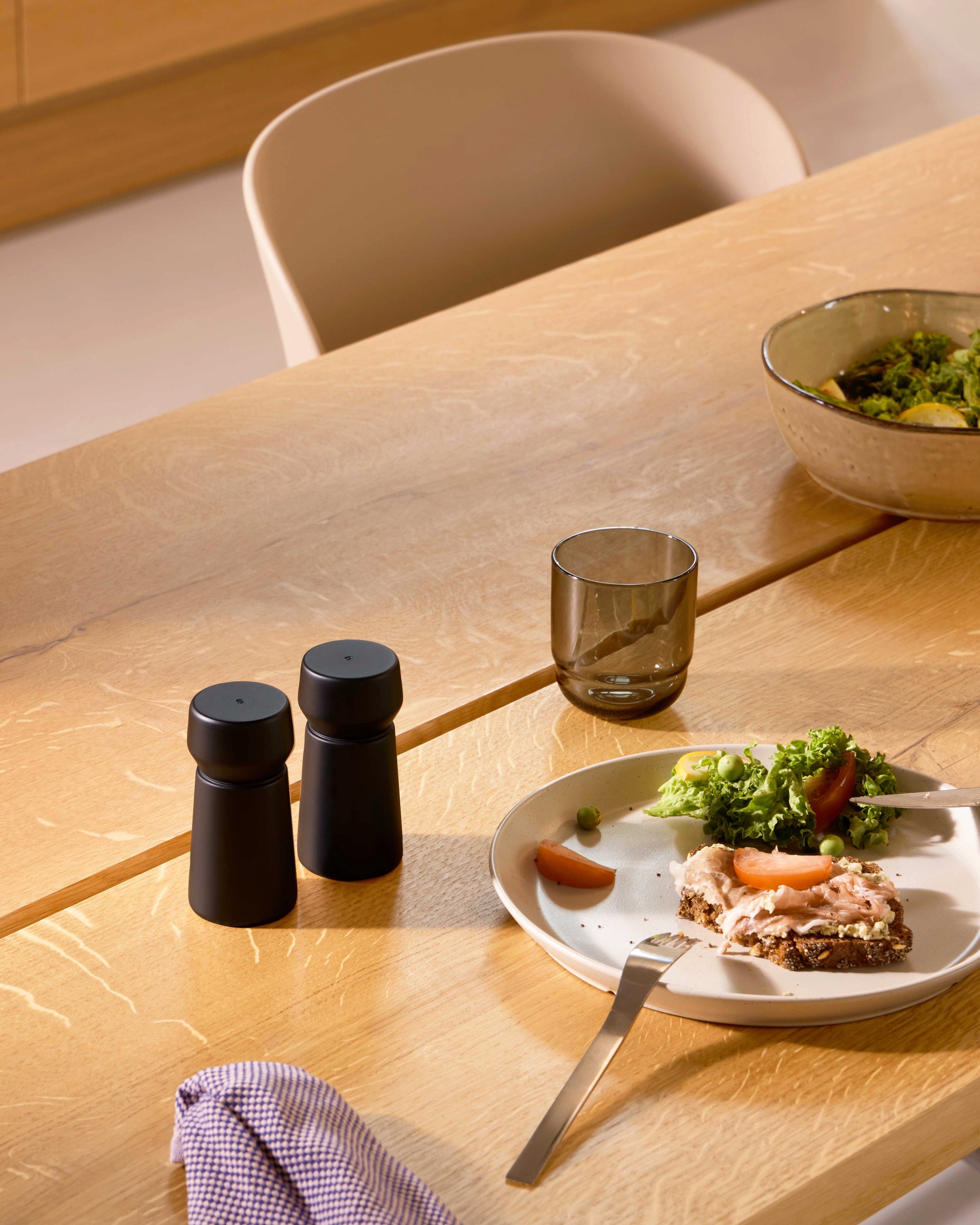 De Amsterdam set brengt met zijn strakke lijnen en geometrische vorm een urbane esthetiek direct in je huis. Gemaakt van hoogwaardig, FSC-gecertificeerd beukenhout, zijn deze twee compacte molens niet alleen optisch een hoogtepunt, maar ook bijzonder handzaam. Dankzij de subtiele gravures voor zout en peper behoud je altijd het overzicht, terwijl het robuuste keramische maalwerk voor duurzame precisie zorgt. Het bijvullen gaat kinderlijk eenvoudig door het bovenste gedeelte er simpelweg af te trekken, zonder lastig schroefwerk. Een stijlvol duo dat minimalistisch design en functionele kwaliteit perfect op je tafel combineert.