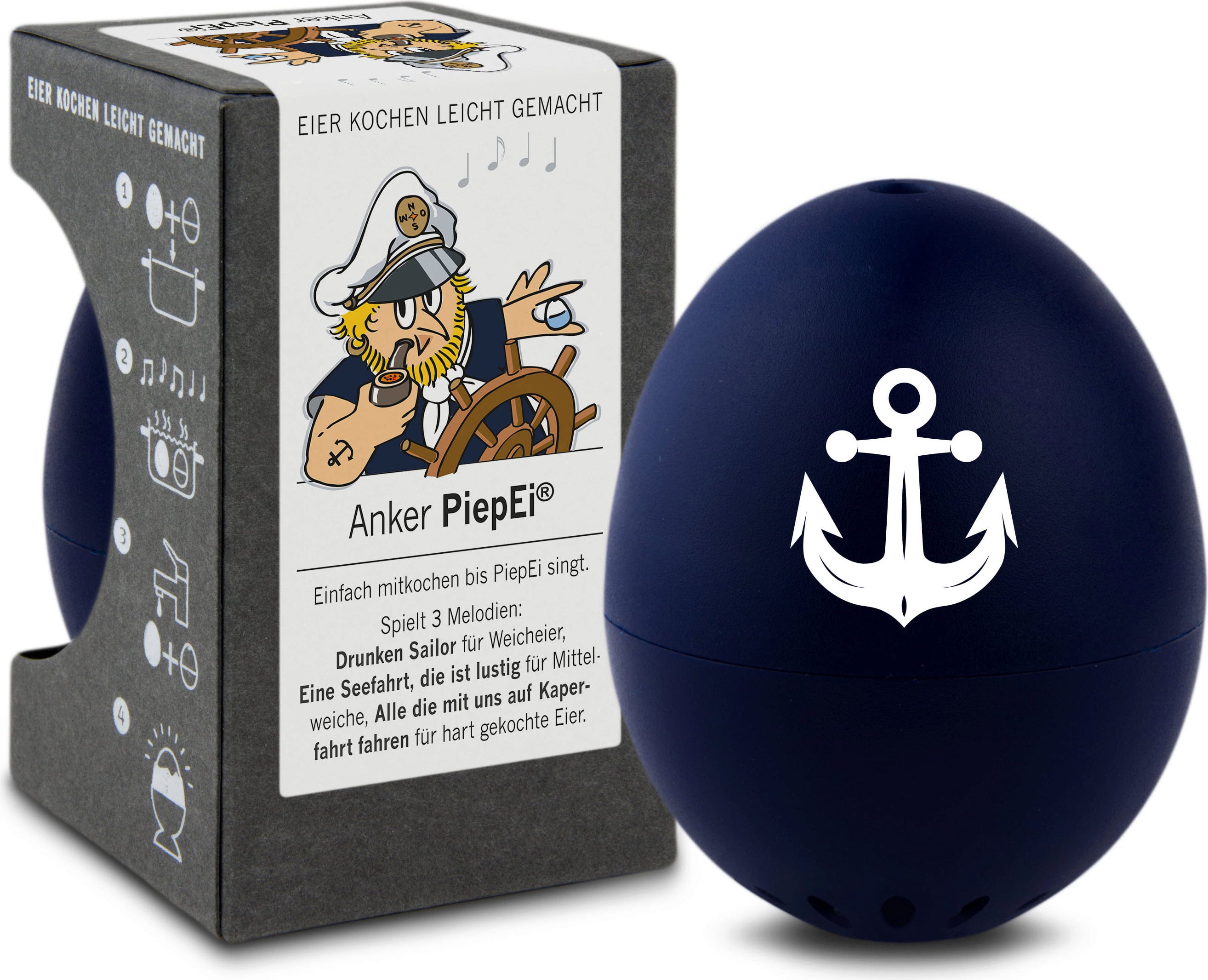 Bewaar het PiepEi gewoon samen met de eieren, kook ze samen en wacht tot de melodie van de gewenste hardheid klinkt. Het maakt niet uit met welke watertemperatuur je begint, hoe groot de eieren zijn of op welke hoogte je kookt.