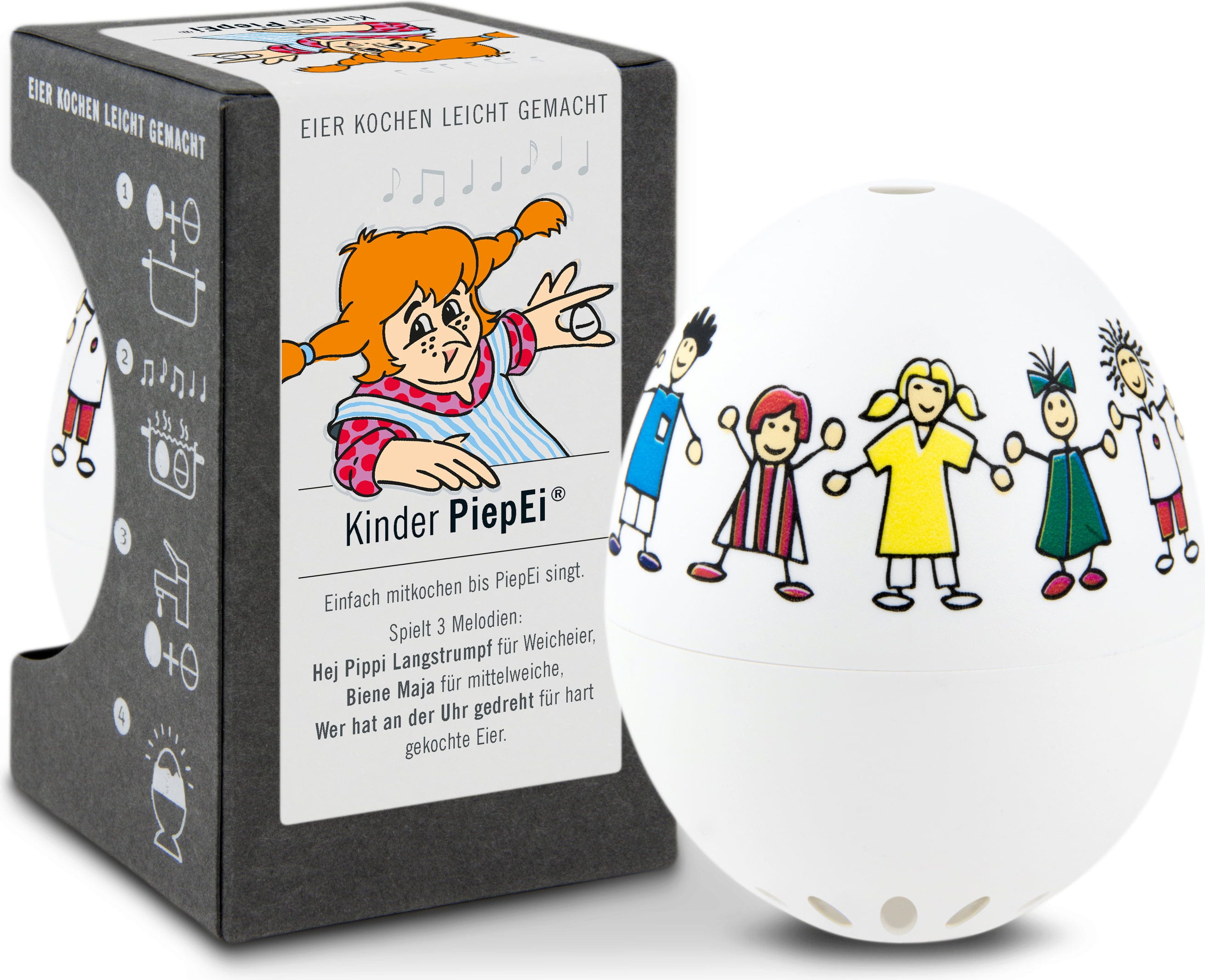Bewaar het PiepEi gewoon samen met de eieren, kook ze samen en wacht tot de melodie van de gewenste hardheid klinkt. Het maakt niet uit met welke watertemperatuur je begint, hoe groot de eieren zijn of op welke hoogte je kookt.