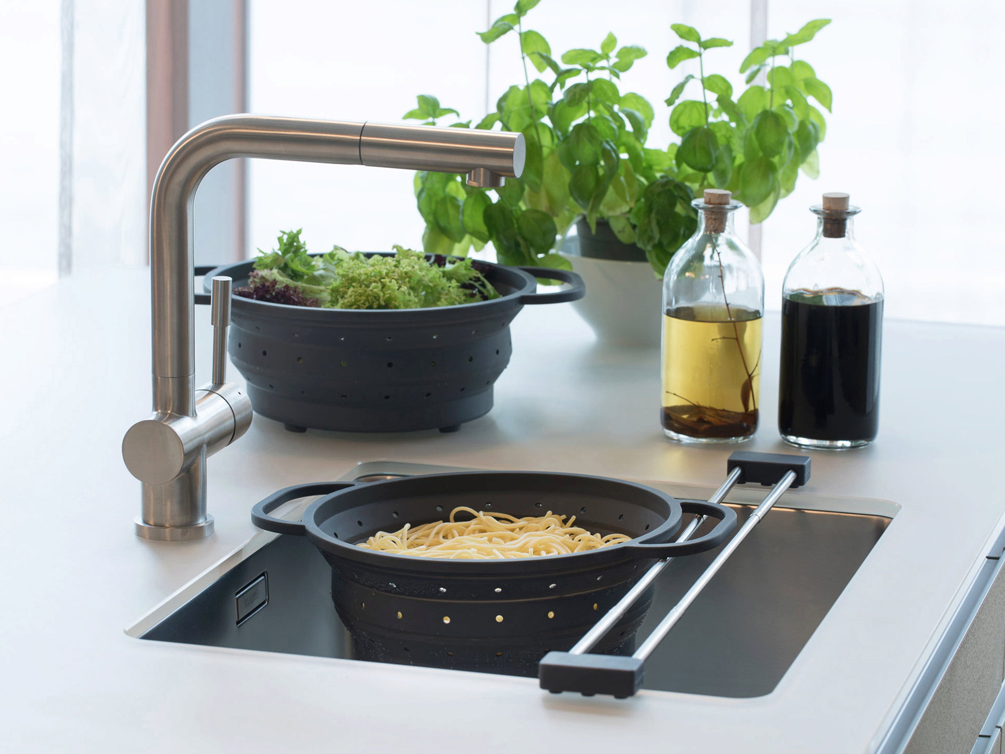 Dankzij de stabiele hengsels laat sieb.up zich perfect combineren met de drip.line, zodat je etenswaren hygiënisch boven de gootsteen zweven en direct kunnen uitlekken. Maar ook zonder houder zorgen de geïntegreerde pootjes ervoor dat niets in het eigen vocht blijft staan. Het hoogwaardige, voedselveilige materiaal is absoluut hittebestendig en kan na het werk heel gemakkelijk in de vaatwasser worden gereinigd. Een waardevolle tool die ruimte creëert en simpelweg voor meer plezier bij het koken zorgt.