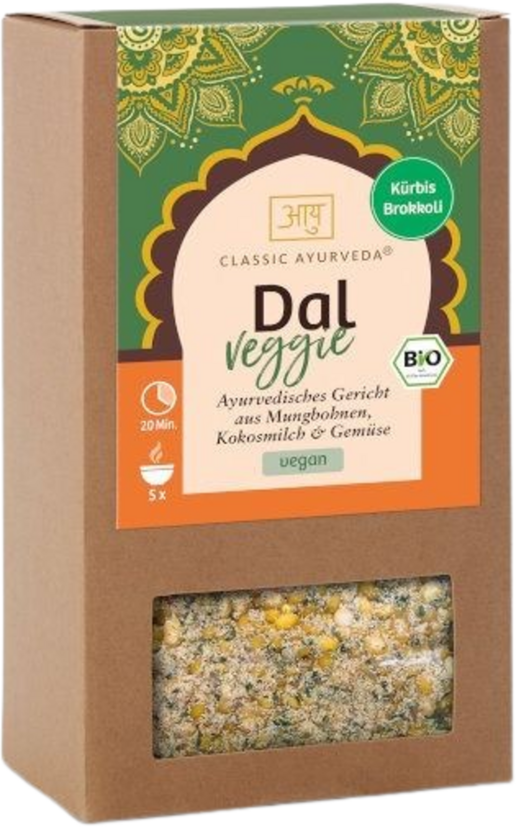 Deze biologische dal van Classic Ayurveda is gebaseerd op zacht gepelde gele mungbonen, die een romige en volle basis vormen. De mix bevat een selectie groenten zoals pompoen, broccoli, wortelen, prei en uien, verfijnd met kokosmelkpoeder voor extra smaak. Een zorgvuldig afgestemde kruidencombinatie van komijn, gember, korianderblad, mosterdzaad, chili en asafoetida zorgt voor een aromatische balans. Het gerecht bestaat volledig uit natuurlijke ingrediënten uit biologisch gecontroleerde teelt en is ontworpen als plantaardige eiwitbron.
