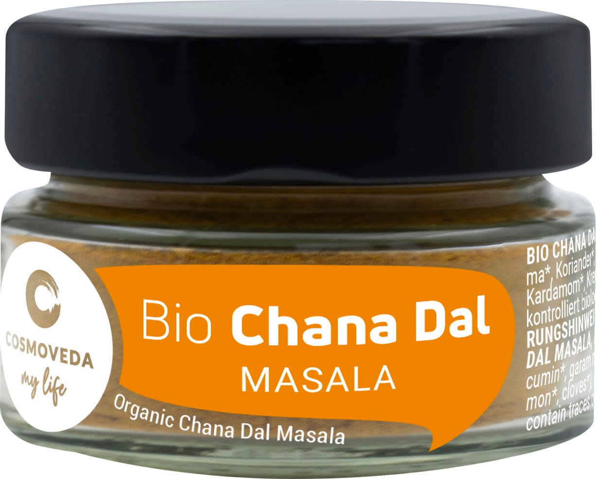 De biologische Chana Dal Masala van Cosmoveda, een speciaal uitgebalanceerde Ayurvedische mix van exquise kruiden waarmee je eenvoudige, heerlijke en licht verteerbare Chana Dal gerechten tovert.