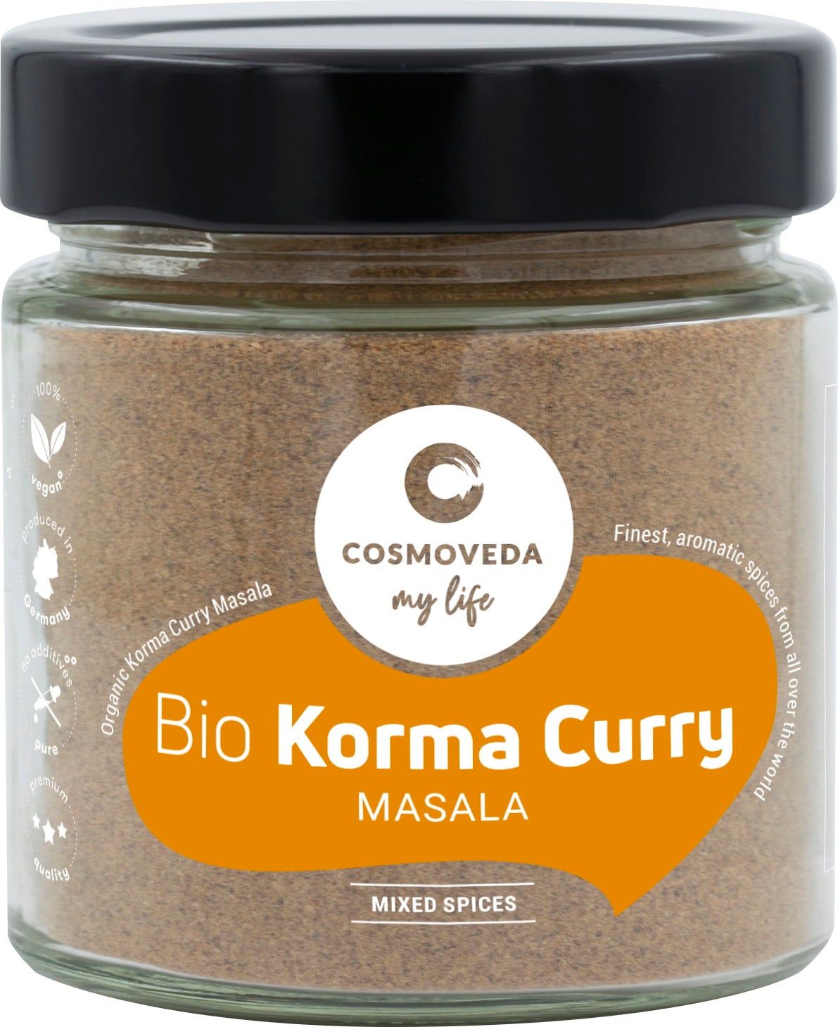 COSMOVEDA Bio Korma Curry Masala, een speciaal uitgebalanceerde Ayurvedische mix van exquise kruiden waarmee je heerlijke Korma curry's tovert.