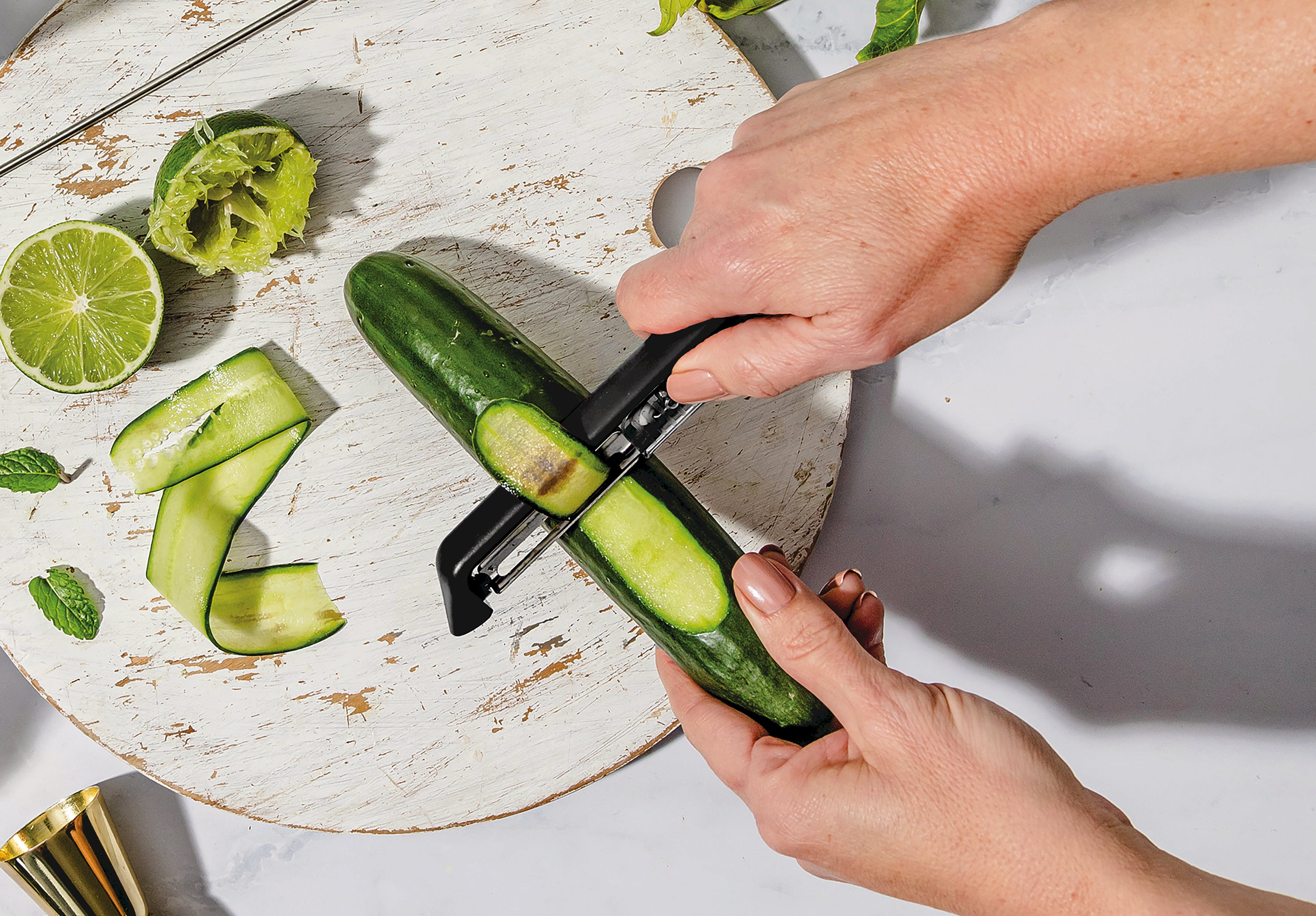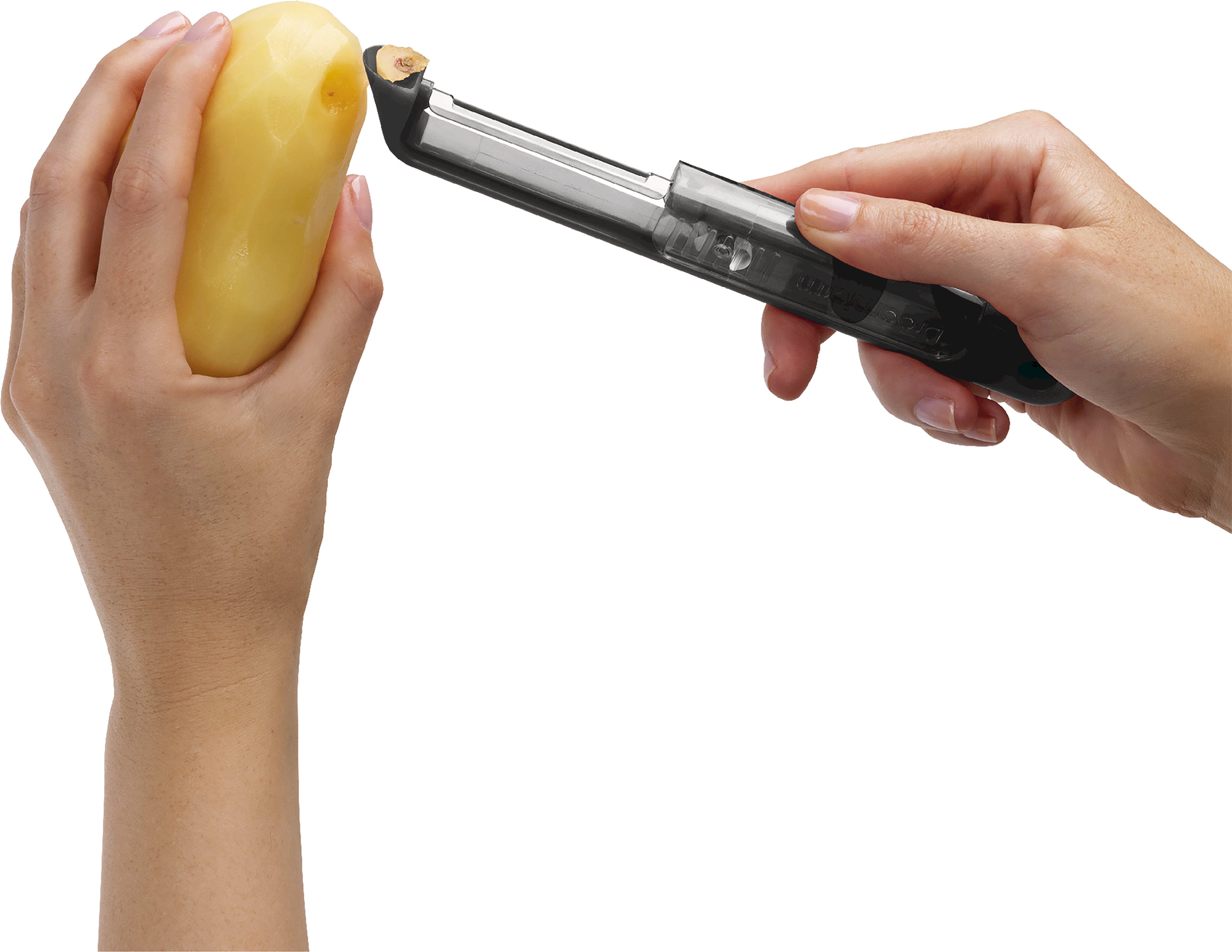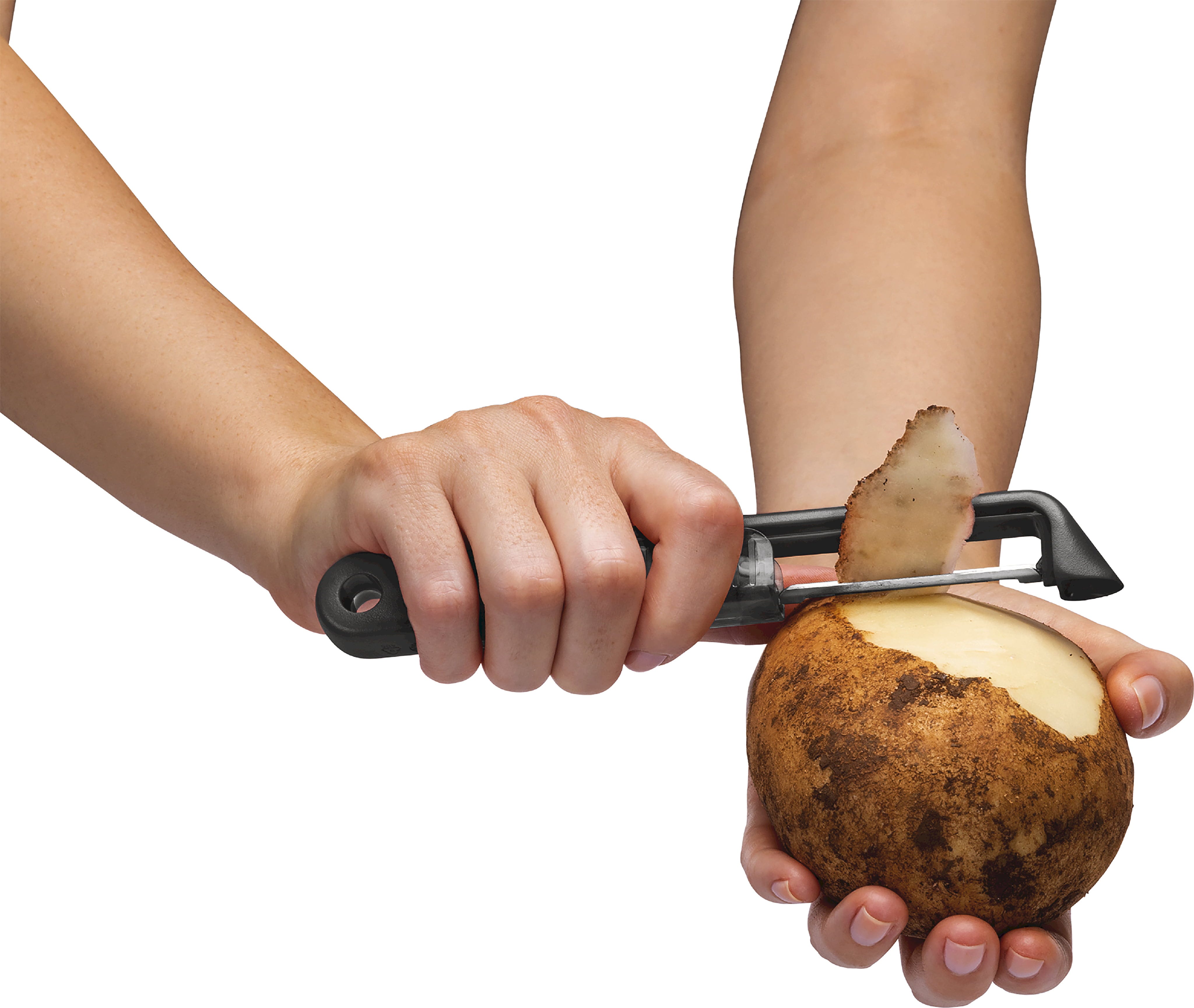 De Dunschiller Sharple van Dreamfarm is uitgerust met een vlijmscherp mes van Japans roestvrij staal, dat dankzij de scharnierende ophanging bijzonder weinig afval produceert. Het absolute hoogtepunt is de innovatieve veiligheidskap: telkens wanneer je de bescherming opent of sluit, slijpt een ingebouwde keramische kogelslijper het mes automatisch bij. Zo glijd je bij elk gebruik moeiteloos door de schil van fruit en groenten, terwijl de geïntegreerde aardappelogensteker oneffen plekjes in een handomdraai verwijdert. Of je nu rechts- of linkshandig bent, deze ergonomische helper ligt perfect in de hand en kan na gebruik voor een eenvoudige reiniging gewoon in de vaatwasser.