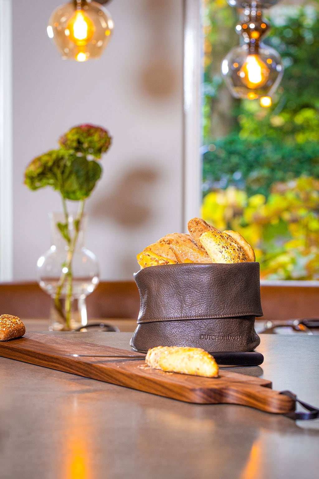 Deze exclusieve broodmand geeft je tafel een heel bijzondere stijl. Gemaakt van robuust leer en hygiënische canvas voering heeft dit buitengewone tafelaccessoire een ongeëvenaarde uitstraling waardoor het een onweerstaanbare blikvanger is. Deze broodmand straalt zowel rustieke als elegante charme uit en is een opwindend andere manier om brood en broodjes te serveren.