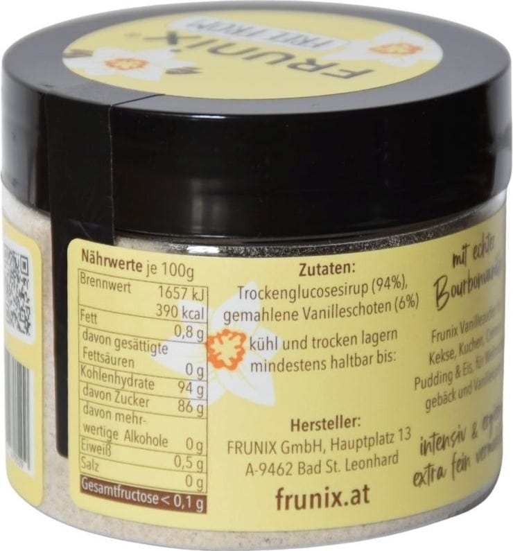 Vanille halve maantjes, fruitsalade dressings, puddingen, cacao - FRUNIX® vanillesuiker met 6% echte bourbon vanille geeft bakwaren, eten en drinken een hemelse vanillesmaak! Dankzij het intense aroma is het product bijzonder zuinig: een theelepel komt overeen met een heel pakje conventionele vanillesuiker - in het begin doseren met gevoel!