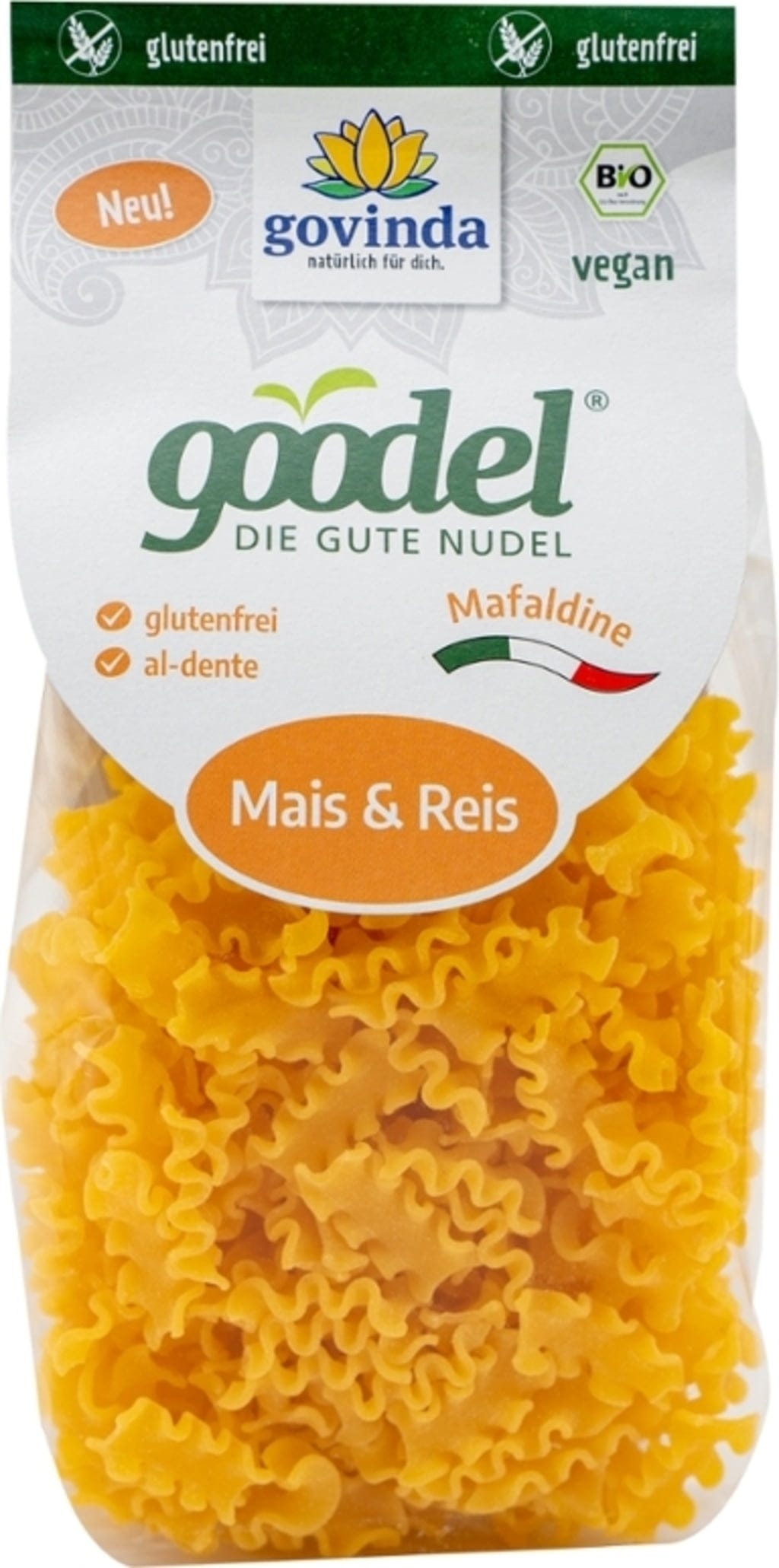 De Goodel Mafaldine van Govinda brengen authentiek Italiaans pastagenot naar de glutenvrije keuken. Deze pasta wordt in een gespecialiseerde Italiaanse manufaktur vervaardigd van maïs en rijst, waarbij het deeg zorgvuldig wordt verwerkt en gedroogd om de ideale textuur te behouden. De karakteristieke golvende vorm van de mafaldine neemt sauzen bijzonder goed op en overtuigt met een milde smaak. Een hoogwaardige biologische alternatief voor iedereen die waarde hecht aan eersteklas ingrediënten en een zorgvuldige verwerking.