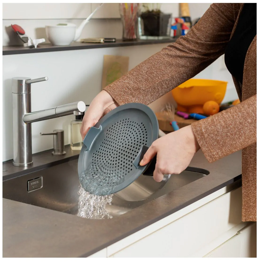Net als alle onderdelen uit de SMART & COMPACT-serie van Kuhn Rikon maakt dit slimme keukenhulpje indruk met zijn ingenieuze 2-in-1-ontwerp. Hij kan zowel als handige afdruiphulp en als praktische spatbescherming tijdens het koken worden gebruikt. De vaak volumineuze uitlekzeef voor pasta, aardappelen enz. is dus niet langer nodig.