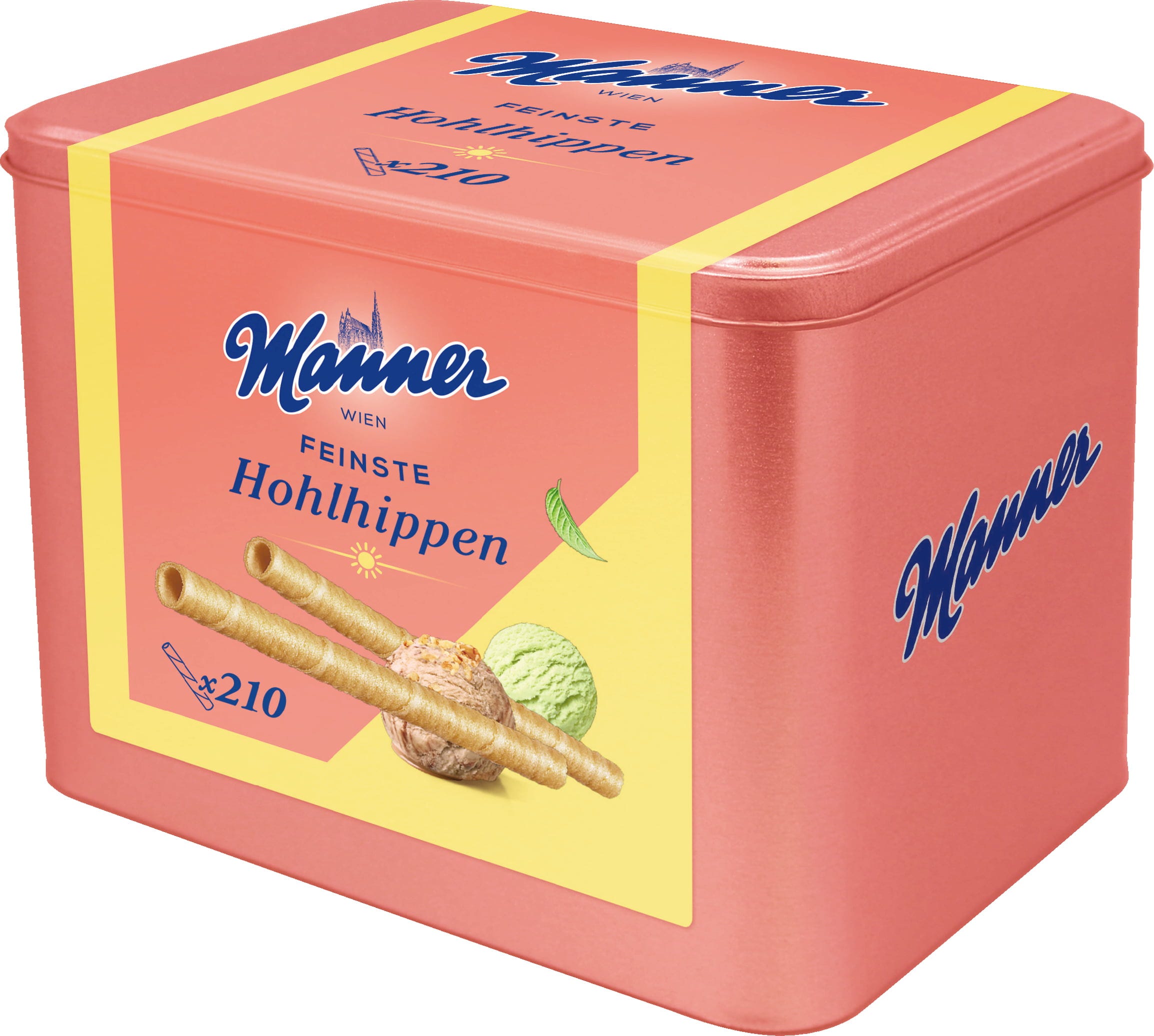 Een ijscoupe zonder holle wafels is als een zomer zonder zon. Gelukkig heb je met het hersluitbare Manner "Hohlhippen" blik met 210 stuks altijd een voorraad holle wafels in huis. Het metalen blik ziet er niet alleen chique uit, maar houdt ook de "Hohlhippen" lang knapperig.