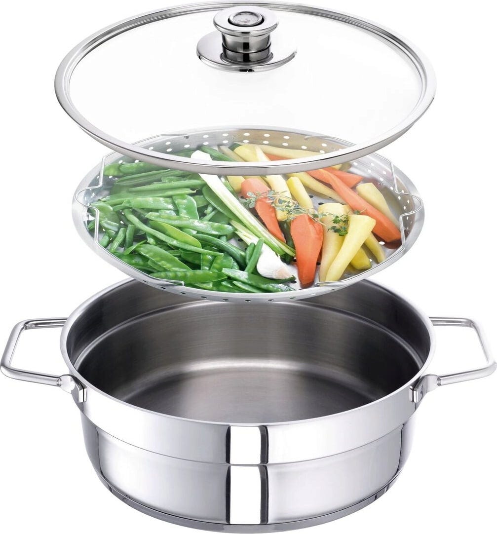 Multifunctioneel kookgerei dat een bijzonder milde en aromatische bereiding mogelijk maakt. Hiervoor voeg je eerst water samen met geselecteerde aroma-ingrediënten toe aan de pan. Zodra het water kookt, plaats je de verse ingrediënten op het stoominzetstuk. Zo blijven alle belangrijke vitamines en voedingsstoffen behouden.