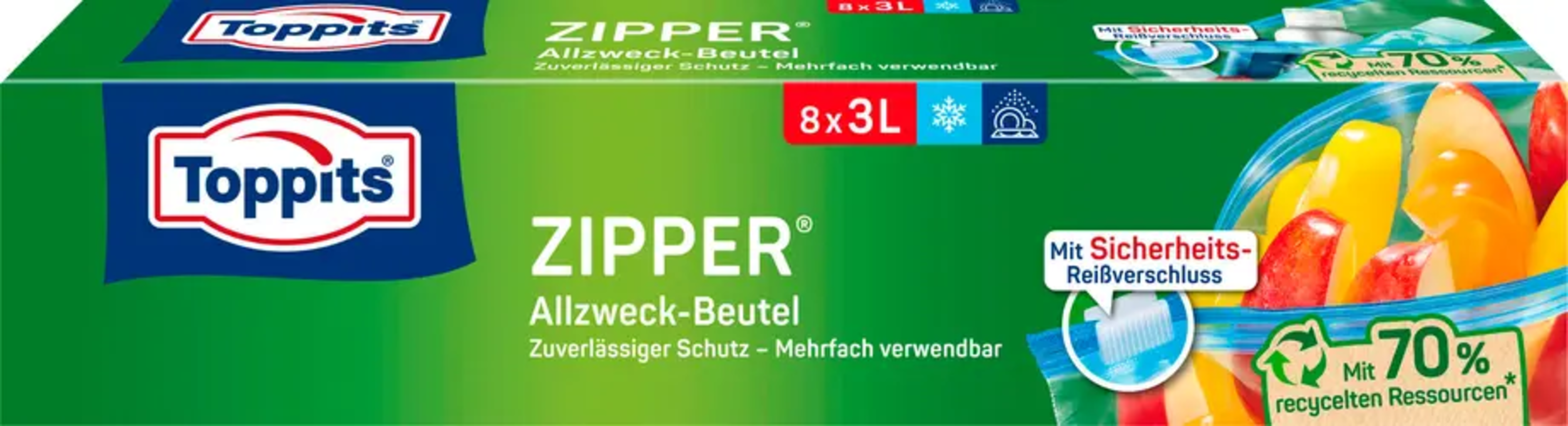 De Toppits Zipper®-zakken voor alle doeleinden zijn praktische, hersluitbare zakken met een zipper die ideaal zijn voor het invriezen, vervoeren of bewaren van levensmiddelen en kleine voorwerpen. De geïntegreerde veiligheidsrits zorgt ervoor dat de zakken goed gesloten blijven.
