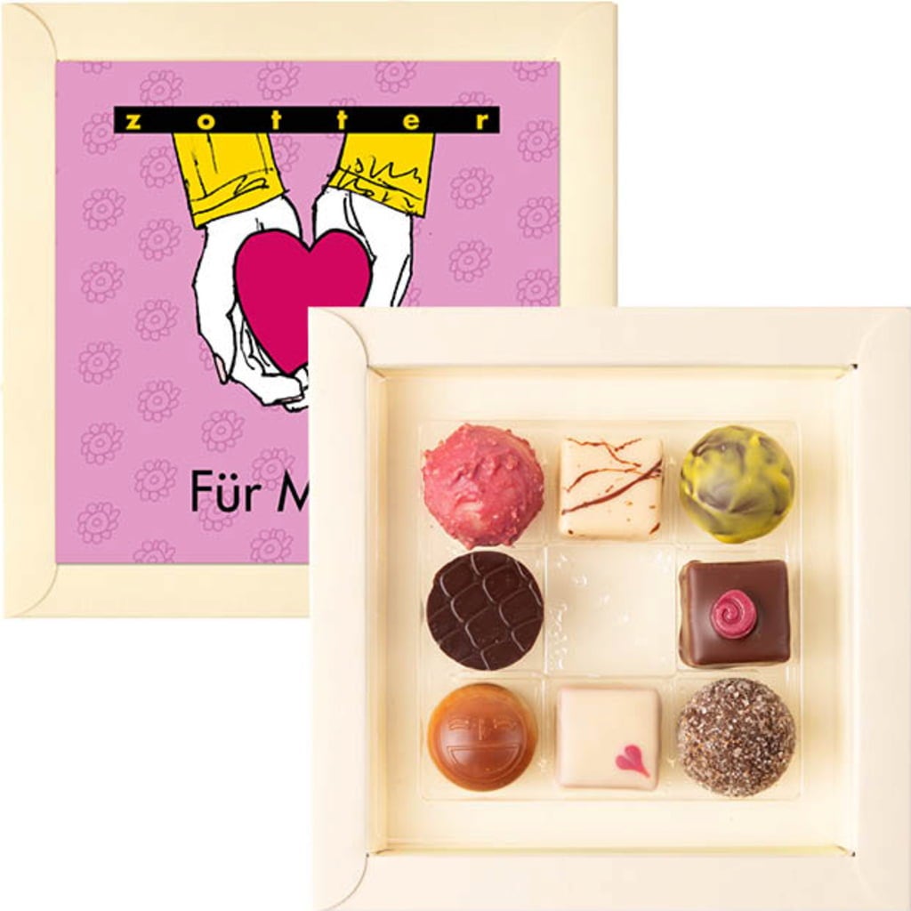 Trendy vormgegeven pralinebox, gevuld met 8 heerlijk verse pralines in de varianten: