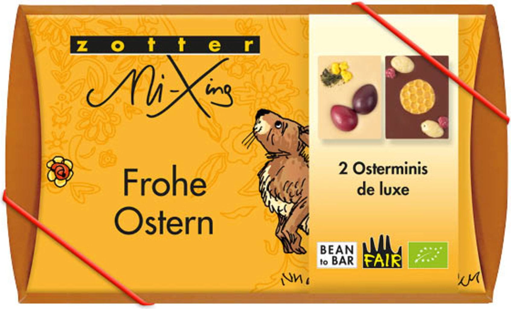 Deze vegan MiXing Osterminis de Luxe geschenkset van Zotter bevat twee liefdevol vormgegeven mini-chocoladerepen. In de decoratieve verpakking vind je een fruitig-aromatische framboos-kokosreep en een witte kokosreep met een vulling van knapperige hazelnootkrokant – stuk voor stuk kunstzinnig versierd en kleurrijk gepresenteerd.